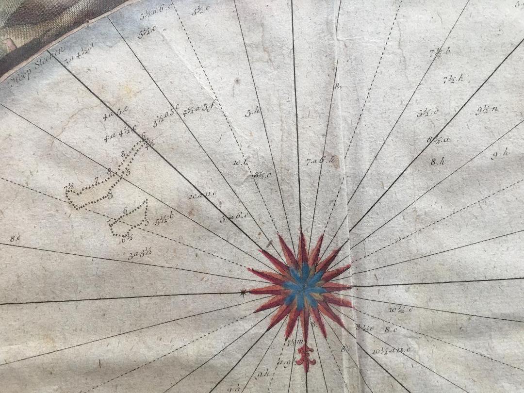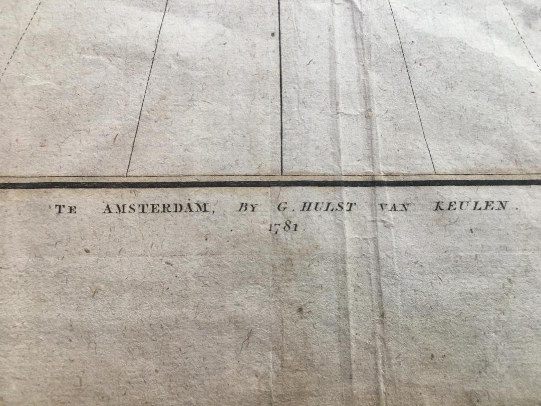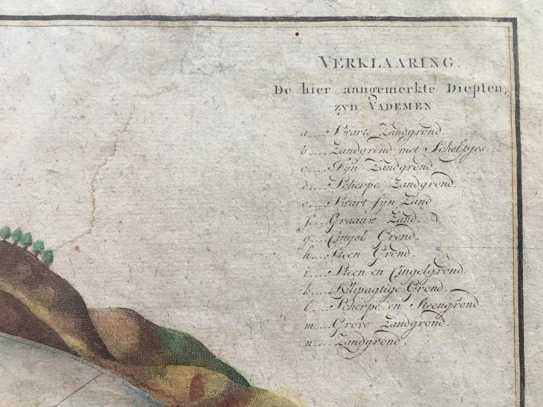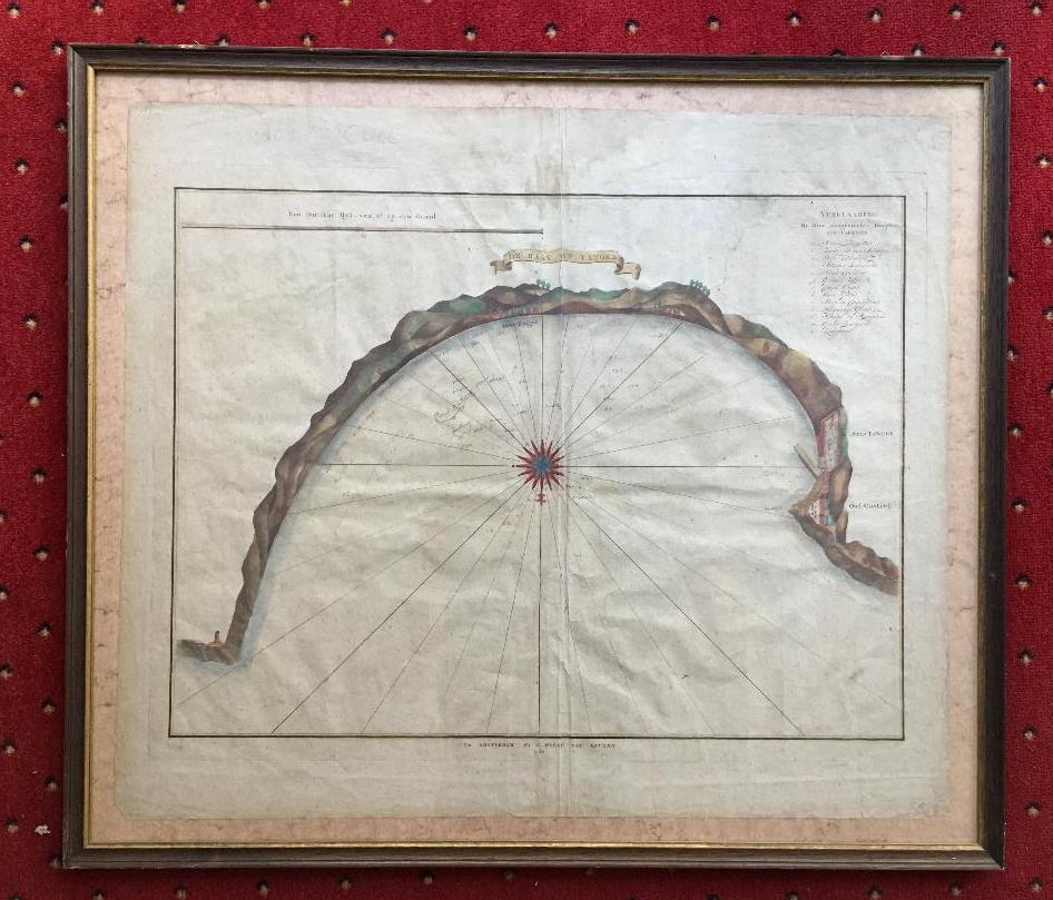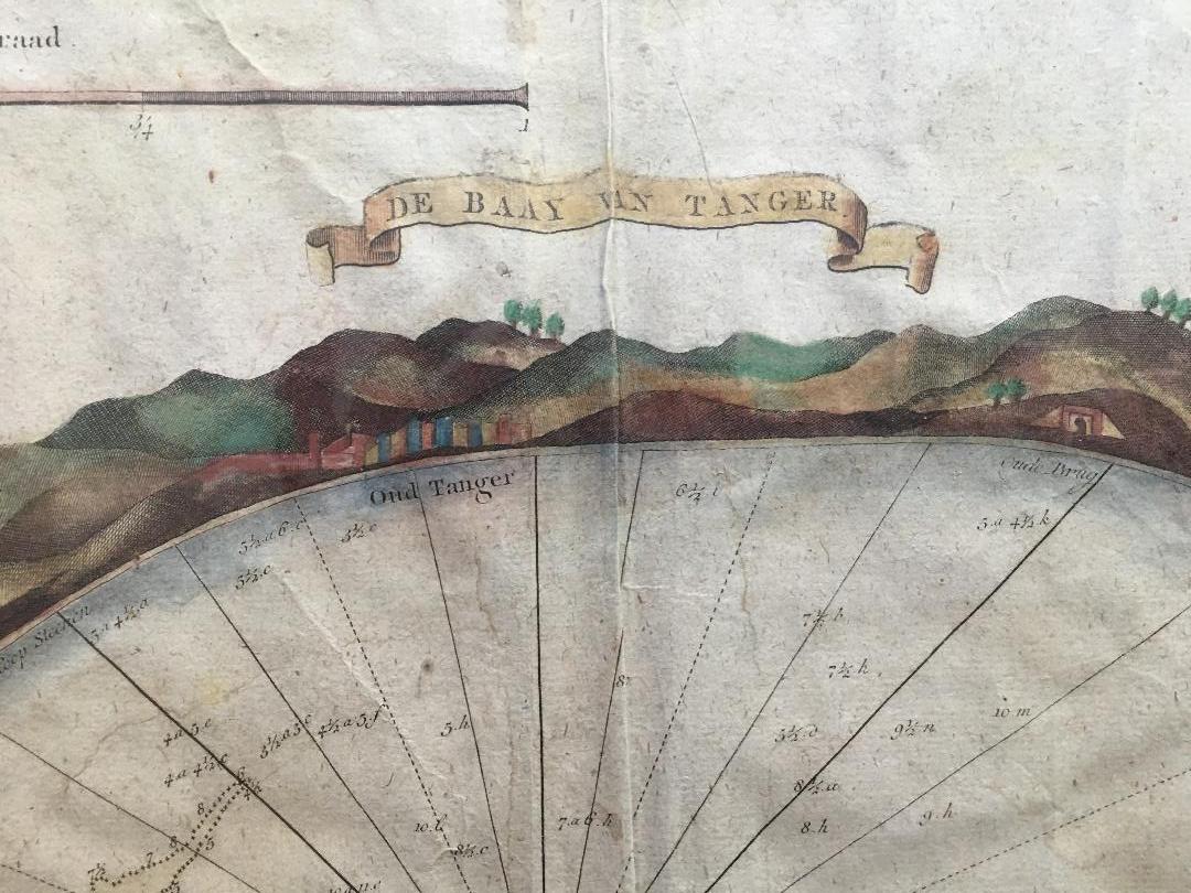 Marokko. – Tanger. – Keulen, [Johannes van]: De Baay van Tanger. Te Amsterdam by G. Hulst van Keulen. Zeigt Bucht mit Windrose, nautische Angaben, oben links Legende a-n. Kupferstich altkoloriert. Amsterdam, Gerard Hulst van Keulen, 1781. 45 x 59 cm (Plattengröße), unter Glas gerahmt, im oberen Bug schwacher Feuchtigkeitsrand, schlichte dekorative Karte, Johannes van Keulen – 1678-1704 tätig in Amsterdam als Kartenverleger, publizierte ‚De Groote nieuwe Zee-Atlas‘ erstmals 1680, dieser wurde in den folgenden Auflagen (ab 1687) auf 5 Bände erweitert.– In 1678, Johannes registered with the Amsterdam Booksellers Guild as a „bookseller and Cross-staff maker“ By this time, most of the Amsterdam chart makers and instrument makers, like Blaeu, Janssonius, Hondius, Goos, and Doncker, had either closed down or were at the end of their fame. As a result, Johannes van Keulen had the opportunity to obtain copperplates, privileges, and stocks of many of his former competitors. Besides manuals and cross-staffs, Johannes produced his famed ‚ZeeAtlas‘ (Sea Atlas, 5 volumes), and ‚ZeeFakkel‘ (Sea pilotbook, 5 volumes).– Gerard Hulst van Keulen, (1733-1801) was the great-grandchild of the founder Johannes.–