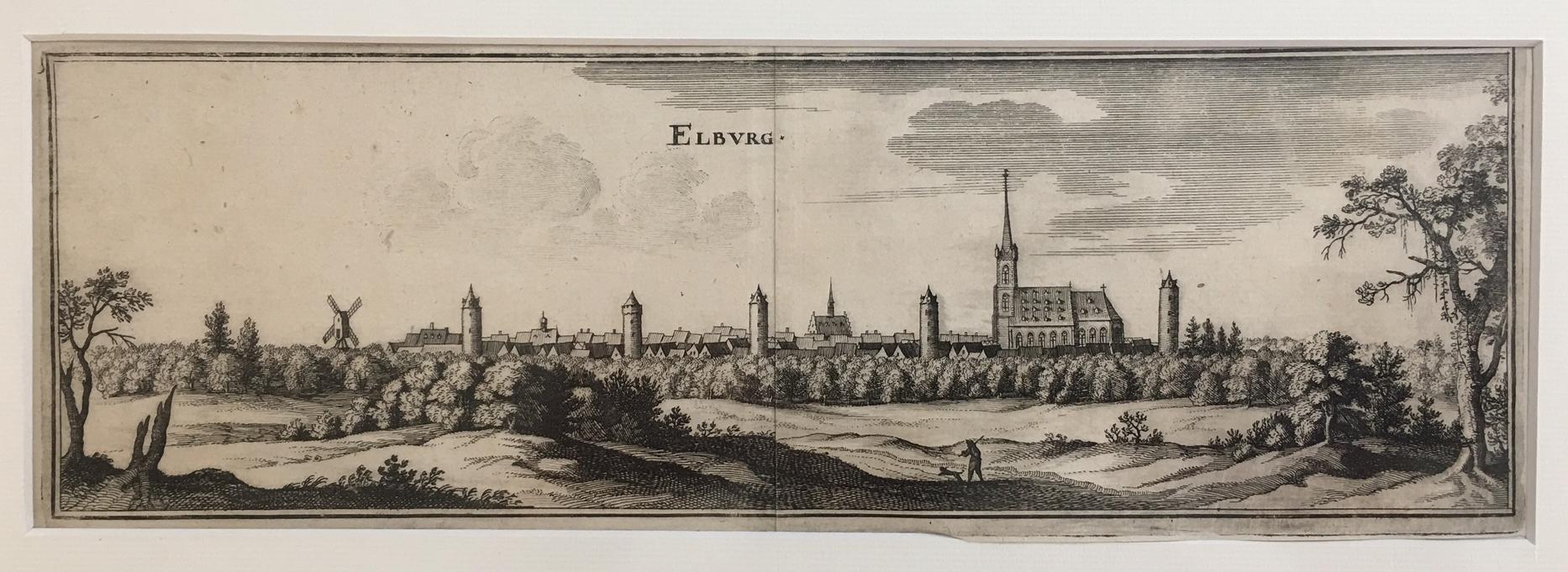 NL – Elburg. – ‚Elburg‘ : Gesamtansicht mit Wiesenlandschaft im Vordergrund. Mit Einfassungslinie. Kupferstich von M. Merian, um 1650. Bildformat 11 x 34 cm, unter Passepartout 30 x 50 cm, *Fauser 3558.– Partnerstadt: Haselünne.–