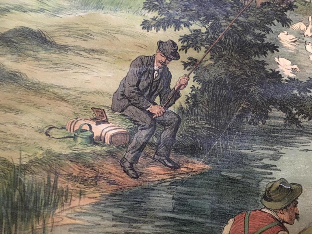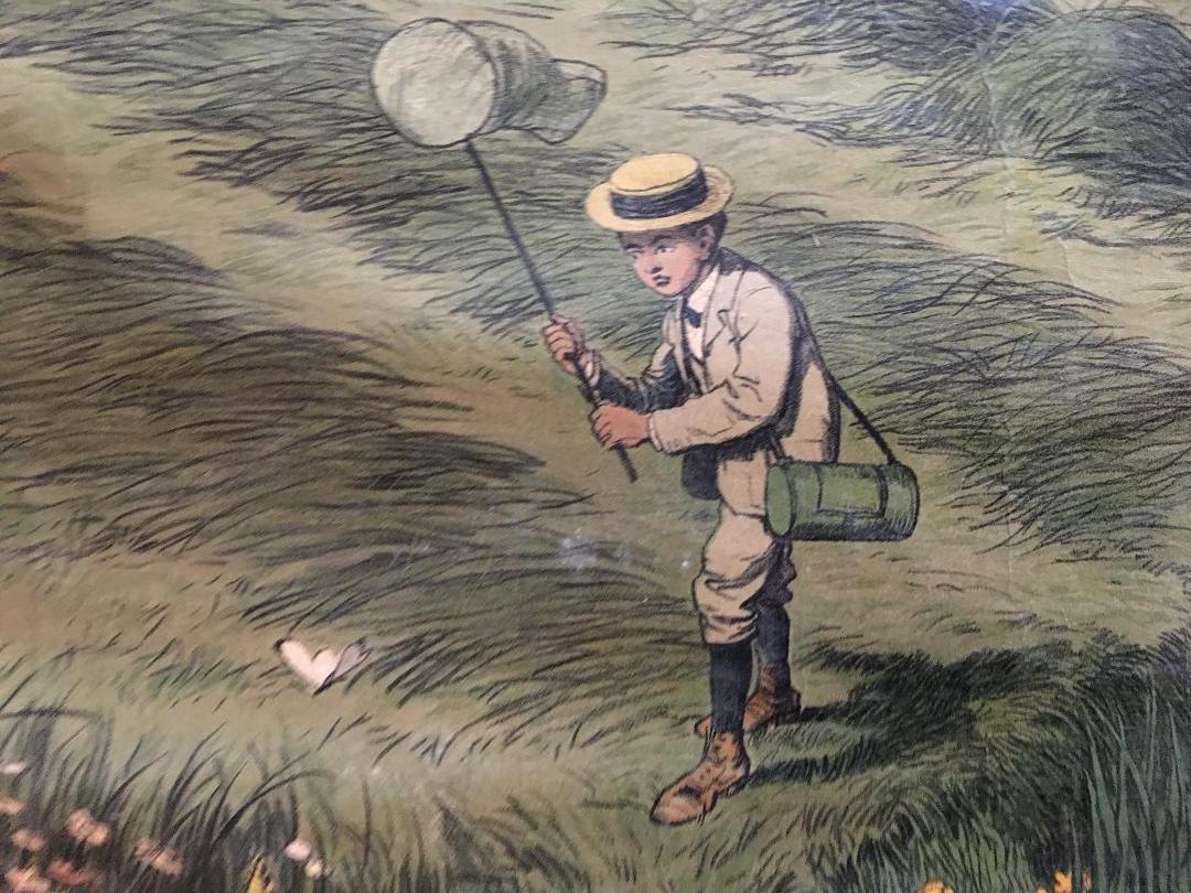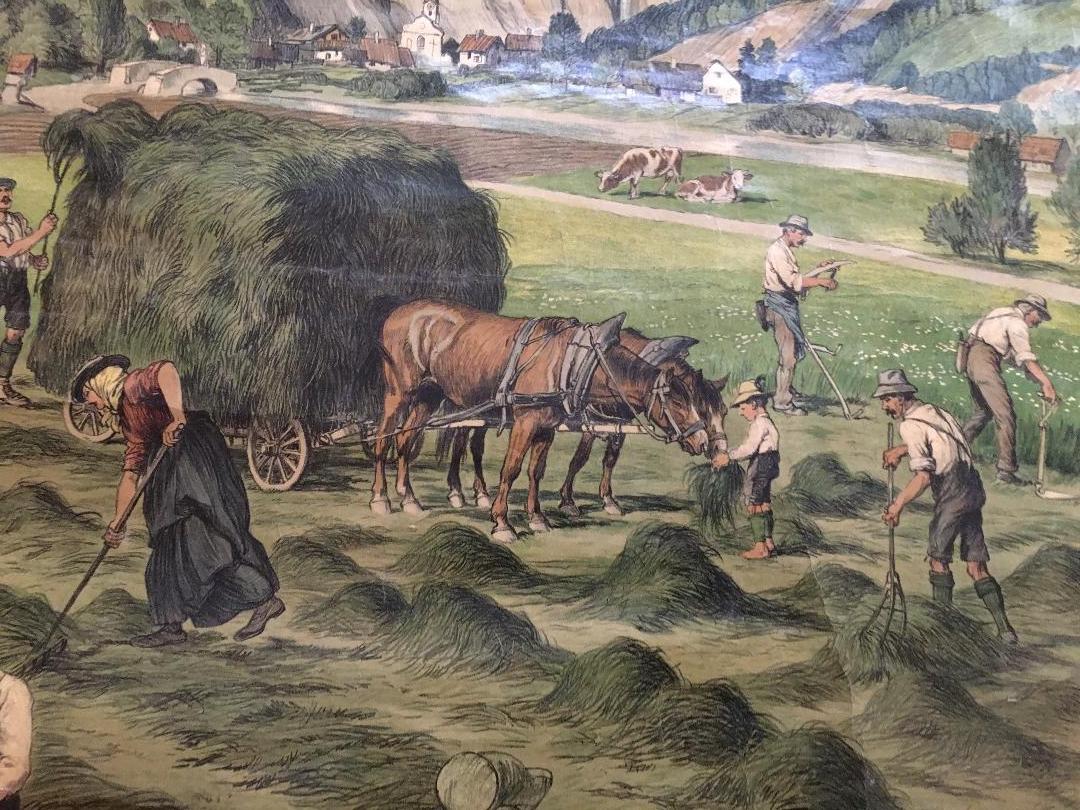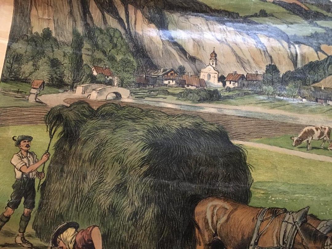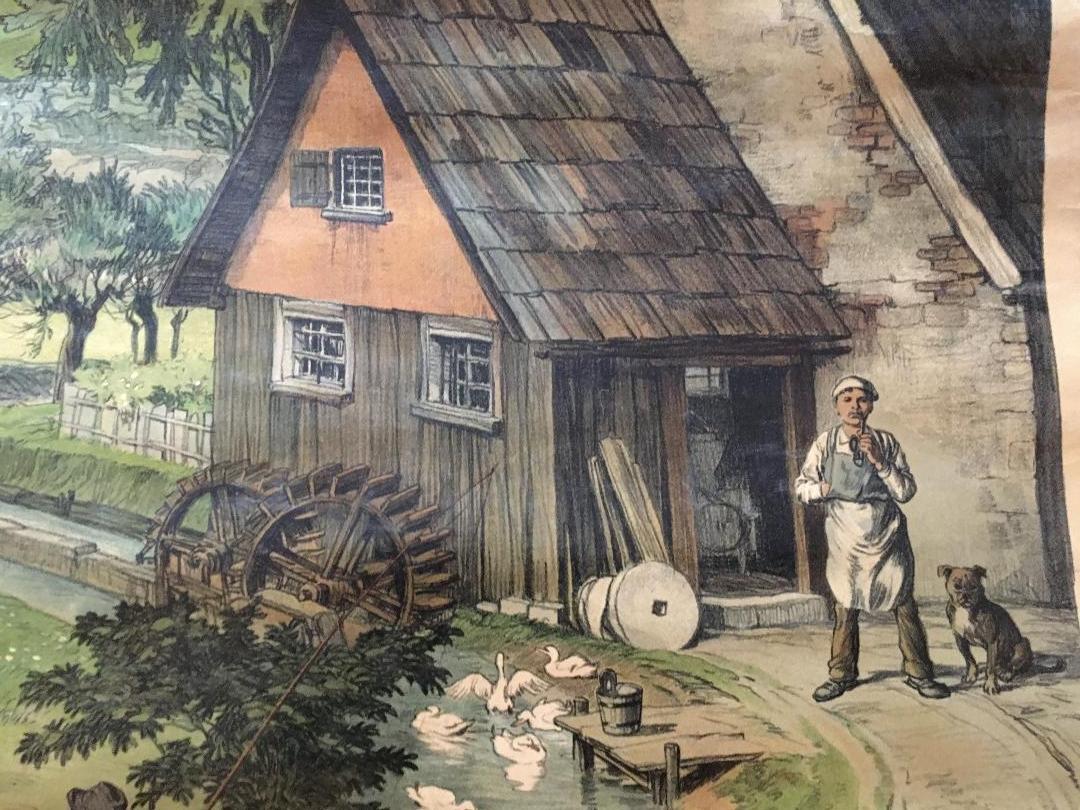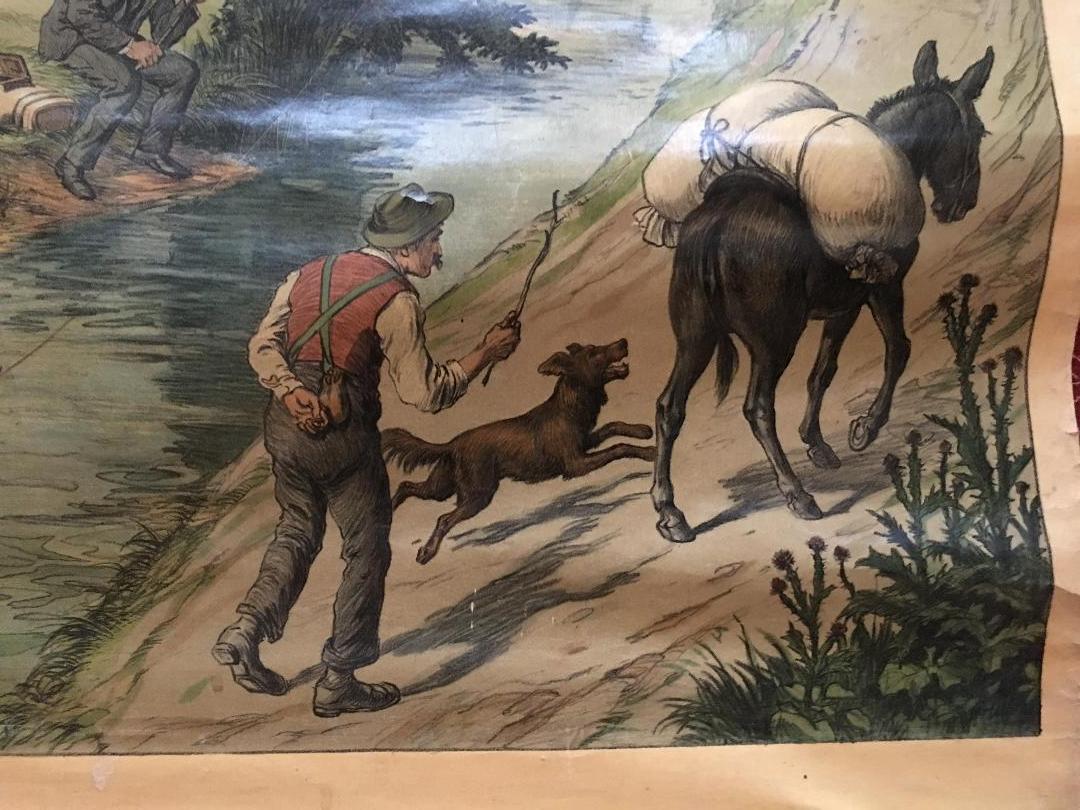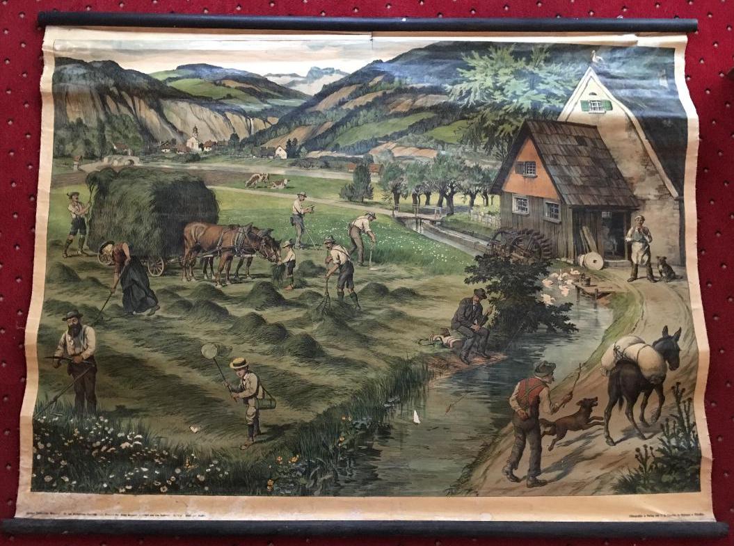 Schulwandtafel. – Kainradl, Leo (1872-1943) (Ill): Wiese und Wasser : Schulwandtafel. (Serie: Schreibers künstlerische Wandbilder für den Anschauungs-Unterricht nach Angaben von Franz Engleder gezeichnet von Leo Kainradl; Tafel 6: Wiese und Wasser). Farb-Lithographie auf Leinwand montiert mit 2 halbrunden Holzleisten. Esslingen-München, Lithographie und Verlag von J.F. Schreiber, [um 1900]. Blattgröße: 90 x 117 cm, angestaubt, kopfseitig kleiner Einriß, im Fluß eine Abriebstelle, mit Rollknittern, * Kunst in Österreich 1934, S.214.– ÖBL 1815-1950, Bd. 3 (Lfg. 12, 1962), S. 178.– dekorative detailreiche Genreszene: Heuernte mit Gespann und mehreren Erntehelfern, davor Schmetterlinge fangender Junge, rechts Müller vor seiner Wassermühle, davor Angler und eseltreibender Bauer, das ganze vor einer Alpen-/Voralpenkette.— Leo Kainradl, Schüler von Griepenkerl an der Wiener Akademie, in den 90er Jahren gehörte er mit Josef Hoffmann, Koloman Moser und Joseph Maria Olbrich den Siebener-Klub an, aus dem sich die Wiener Secession entwicklte. 1903-14 Mitarbeiter der ‚Meggendorfer Blätter‘, ab 1922 Schriftleiter der ‚Fliegenden Blätter‘.–