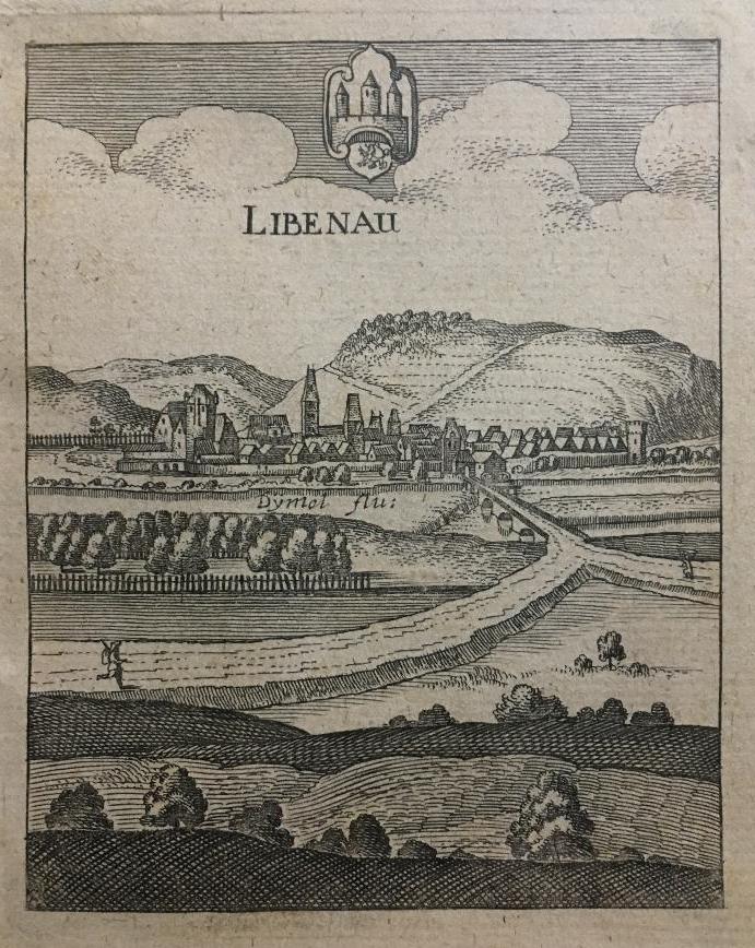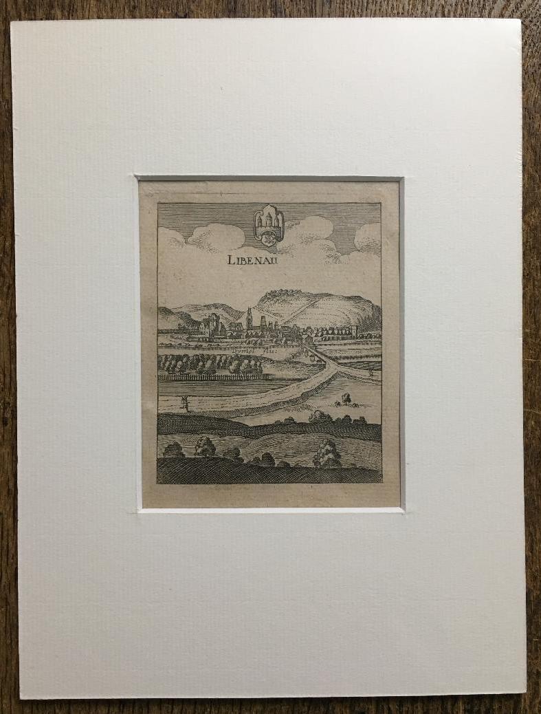 Liebenau (Hessen). – ‚Libenau‘ : Ansicht über die Diemel auf die Stadt, oben Stadtwappen.– Kupferstich aus M. Merian, Topographia Hassiae, 1646. Bildformat 10 x 8 cm, unter Passepartout 24 x 18 cm,