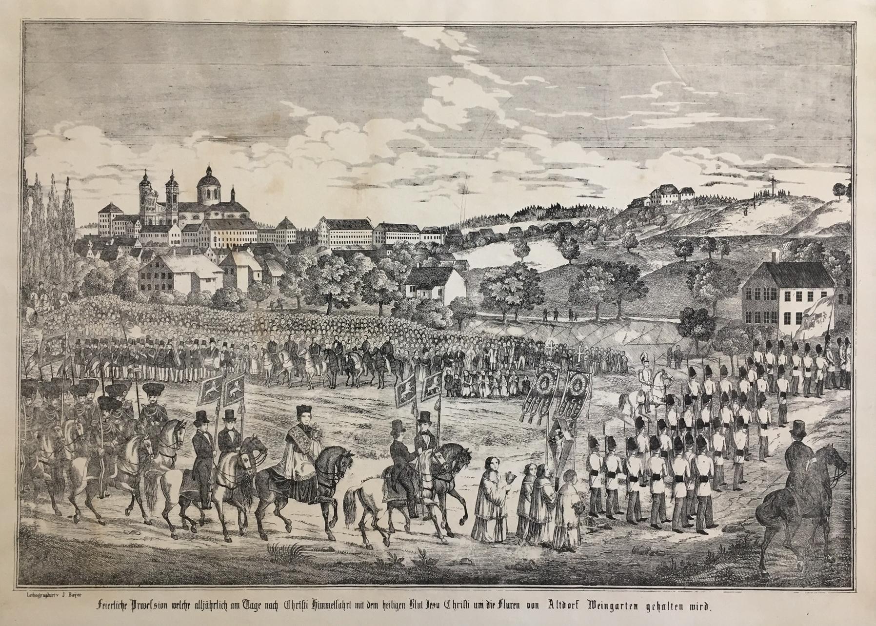 Weingarten. – Blutritt. – Joseph Bayer (1820-1879) ‚Festliche Prozession welche alljährlich am Tage nach Christi Himmelfahrt mit dem heiligen Blut Jesu Christi um die Fluren von Altdorf Weingarten gehalten wird‘ : Lithographie von Joseph Bayer, Ravensburg, J. Bayer, [1849]. Bildformat 28 x 42 cm, schwach braunfleckig, schönes dekoratives Blatt, [Heinz, Der Lithograph Joseph Bayer; mit Abb. S. 59.– Schefold, Württemberg; 10926],