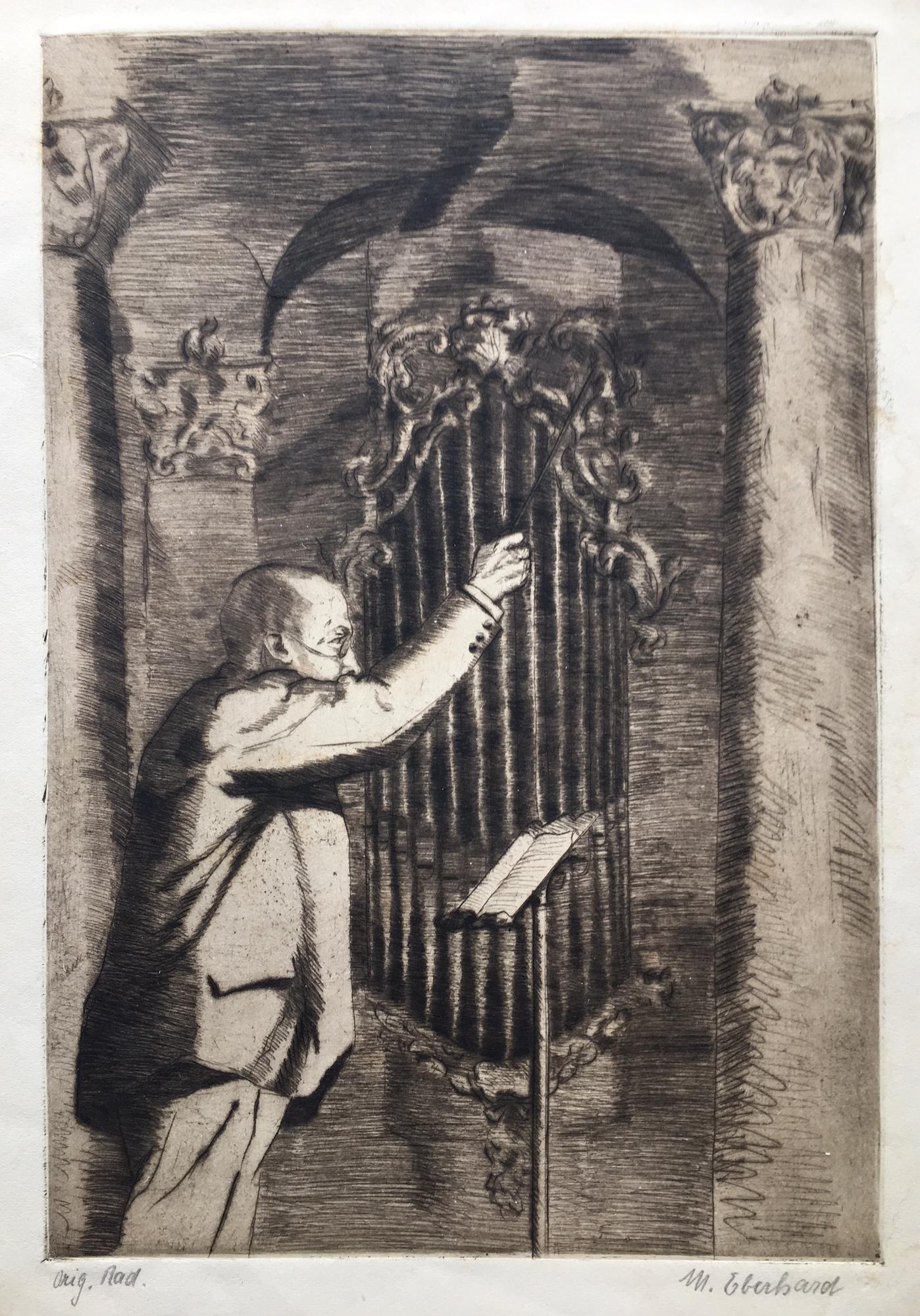 Eberhard, Marie (1897 Ravensburg – 1975 Weingarten). – ‚Der Dirigent‘ : Radierung : handsigniert. Weingarten, um 1940. Bildgröße 27 x 18,5 cm, unter Passepartout 40 x 30 cm, *Nagel, Schwäbisches Künstlerlexikon; 34.– Malerin in Weingarten, ab 1916 an der Damenakademie des Münchener Künstlerinnenvereins, ab 1918 Studium an der Akademie München bei Hugo von Habermann.–