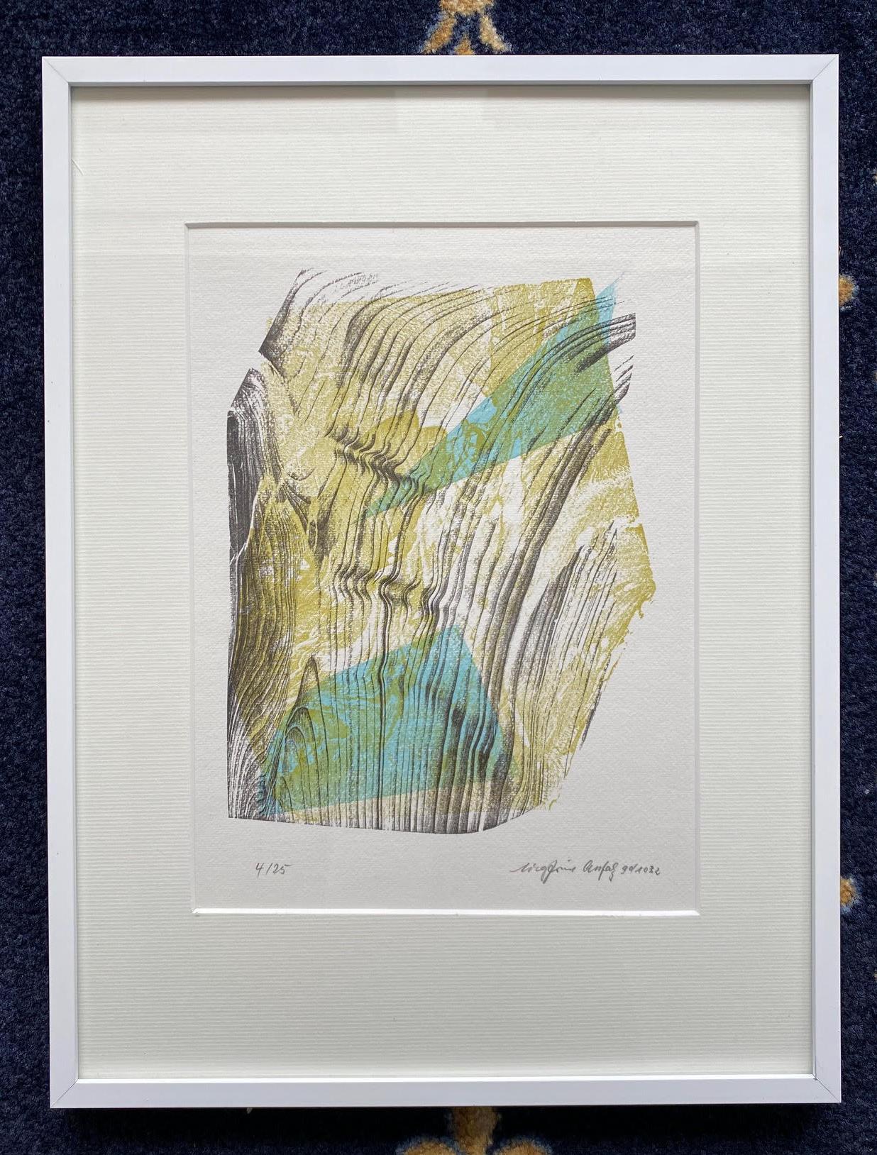 Aßfalg, Siegfried (1925 – 2012 Biberach). – ‚Organischer Holzdruck‘ : Holz- und Farbdruck : mit Bleistift numeriert 4/25, signiert und bezeichnet 90/1032 : (Biberach), 1990. Blattgröße 38 x 25 cm, unter Passepartout 40 x 30 cm, wohnfertig gerahmt, *Nagel, Schwäbisches Künstlerlexikon; 17 Die Komposition der Holzdrucke mit ihren natürlichen Strukturen und klaren geometrischen Formen sind Aßfalgs Markenzeichen.