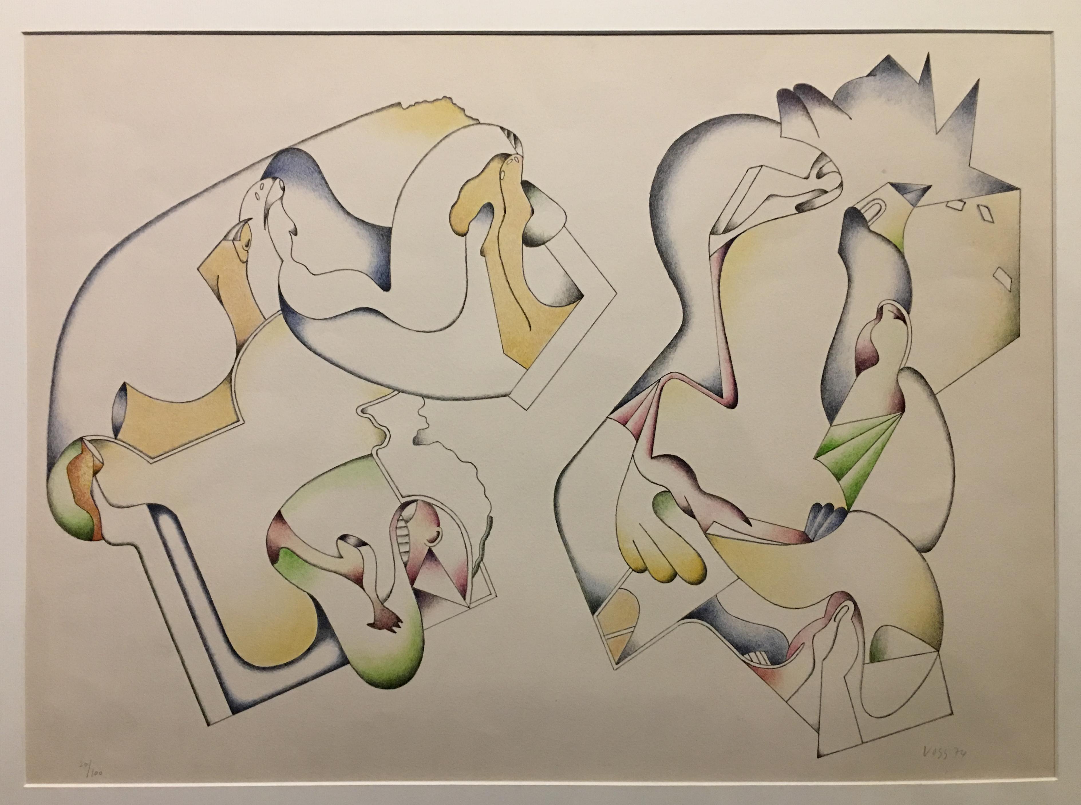 Voss, Jan (1936 –). – ‚Ohne Titel‘’ : Farblithographie : mit Bleistift numeriert 4/100, signiert und datiert ’74. (Paris). 1974. Blattgröße 50 x 65 cm, unter Passepartout 60 x 80 cm, Das Grundthema seiner Malerei ist das ‚Geordnete‘ eines sich in ständiger Bewegung befindlichen Chaos einer diffizilen und kleinteiligen Situation. Seine Zeichnungen wirken wie Comic-hafte Erzählungen und enthalten viele Details.–