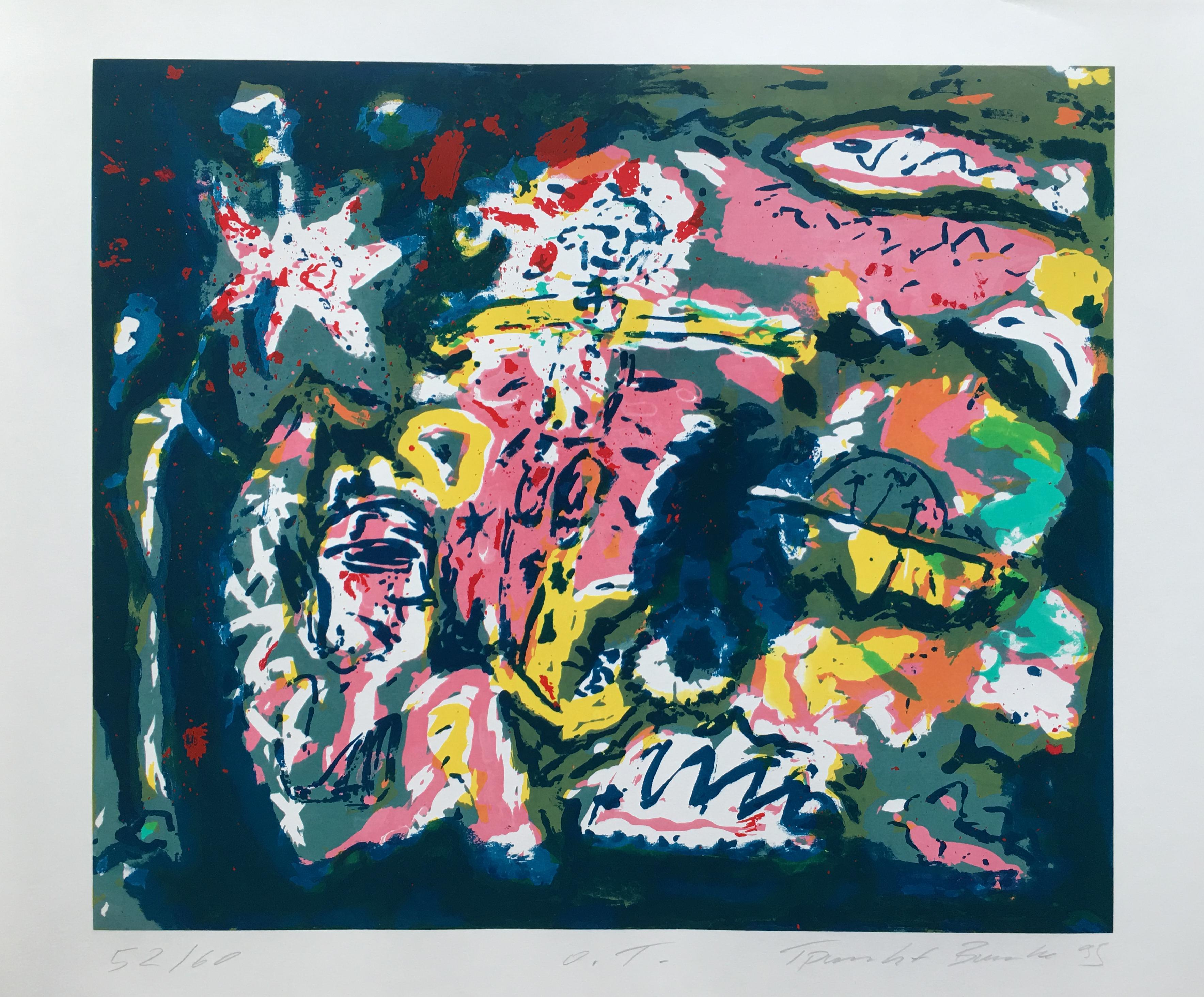 Baake, Thomas (*1958). – ‚o. T.‘ : Serigrafie numeriert 52/60, handsigniert, datiert ’95. 1995. Bildformat 42,5 x 50 cm, unter Passepartout 50 x 60 cm, 1985 Studium Malerei und Grafik an der Hochschule für Bildende Künste Dresden.– 1990 bis 1992 Meisterschüler bei Johannes Heisig und Wolfgang Rother.– lebt und arbeitet in Dresden und Berlin.–