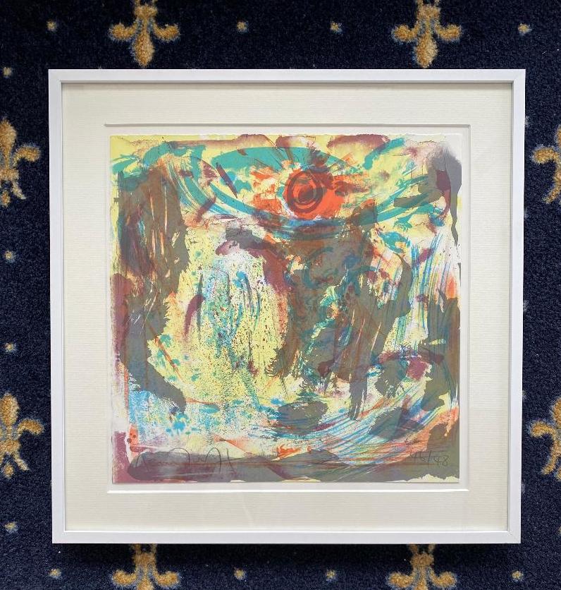 Heindorff, Michael (*1949). – ‚The Baron in the Trees‘ : unten links handsigniert, unten rechts numeriert 48/48, Farblithographie, London, RCA Royal College of Art, 1987. Bildformat 32.5 x 30.5 cm, frei in Passepartout wohnfertig gerahmt in weissem Alurahmen 40 x 40 cm, from the RCA Artist’s Choice Portfolio.– Michael Heindorff attended art college and University of Braunschweig, Germany, 1970-74, gaining a German National Scholarship, 1972-76, and a DAAD scholarship for London, 1976/77, attending Royal College of Art.– Heindorff was proficient in different medias and styles, but over the years moved away from figuration towards abstraction. In 1976, he won a John Moores Prize at Walker Art Gallery, Liverpool, later winning the prestigeous Schmidt-Rottluff Prize and Villa Massimo Prize. A retrospective was held in 1987 at Northern Centre for Contemporary Arts. Heindorff taught at Royal College of Art and was included in its Exhibition Road Show of 1988. The Tate and Arts Council hold works, and he is included in many important public and private collections.