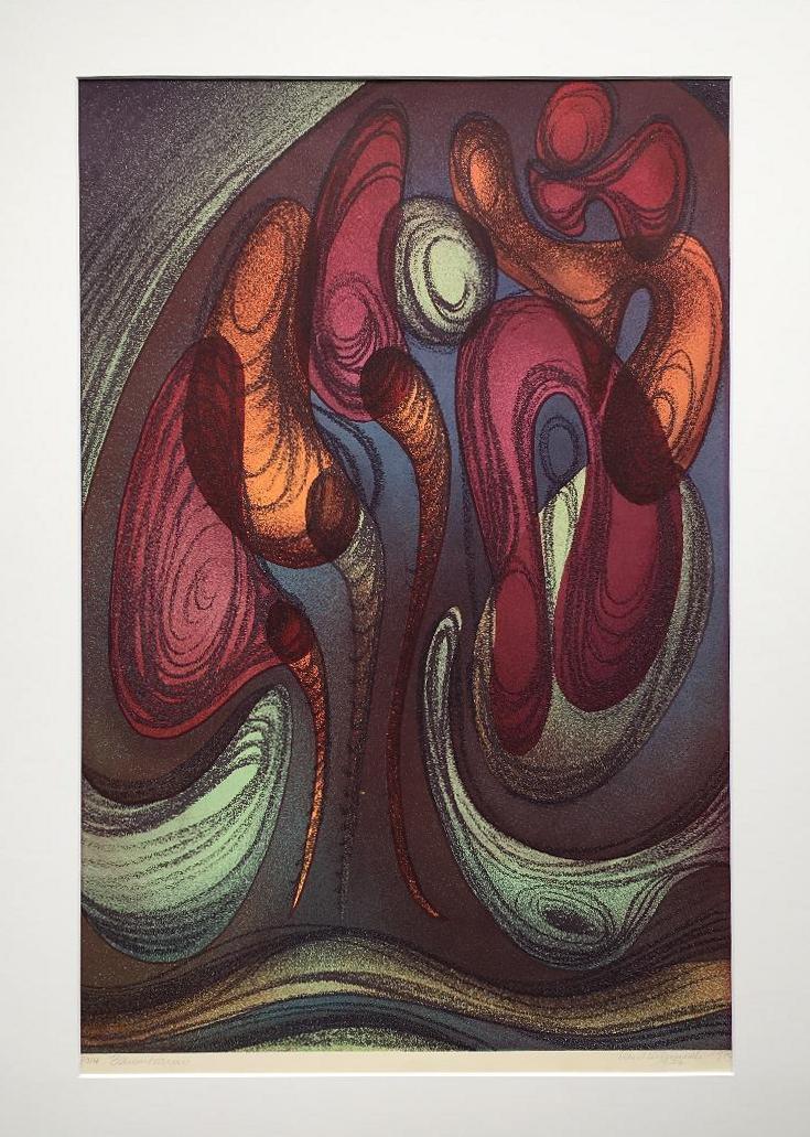 Kimmich, Kurt (1932 – 2016). – ‚Baumtraum‘ : Farblithographie bezeichnet, handsigniert und datiert. Isny, 1974. Blatt 60 x 40 cm, unter Passepartout 70 x 50 cm,