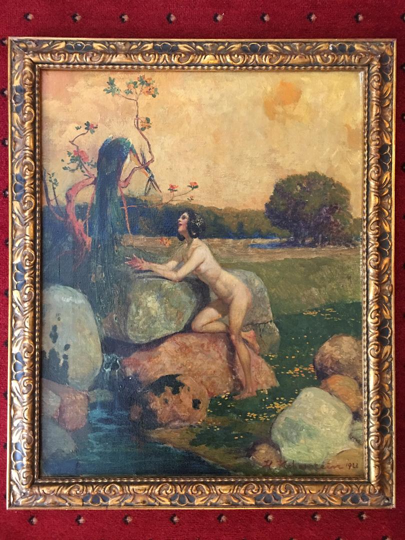 Koberstein, Hans (1864 Schulpforta – 1945 Berlin). – ‚Nymphe und Paradiesvogel‘ : Nackte Schöne in Bach-Landschaft erbittet unter einem Ast von einem Paradiesvogel einen Reif. Öl auf Leinwand, signiert und datiert unten rechts 1922 in zeitgenössischem florentinischem Holzrahmen. Berlin, 1922. Rahmenformat 57 x 47 cm, Bildformat 49 x 39 cm, schöner gepflegter Zustand, *Thieme/Becker XXI, 60f.– Akadmische Ausbildung in Dresden und Berlin bei Max Fr. Koch und Otto Lessing.– Mitglied der Berliner Künstlervereinigungen, schuf monumentale Figurenbilder, Allegorien und Ölbilder des historischen Genre sowie Märchen und Legenden.–