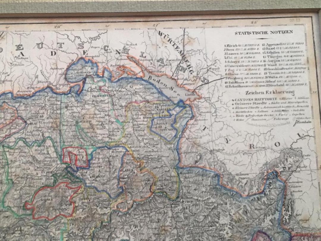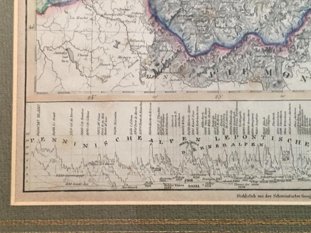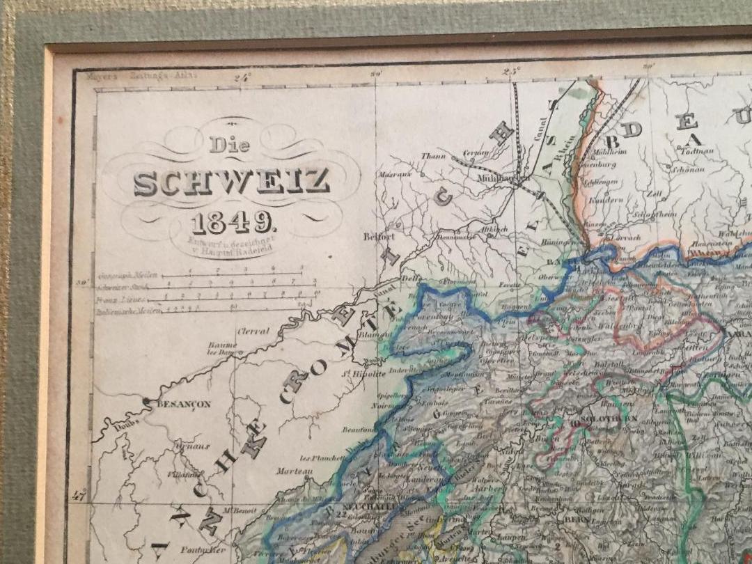 CH. – Radefeld, Hauptmann (Ill): Die Schweiz 1849 : Stahlstich entworf (!) und gezeichnet von Hauptm. Radefeld, gestochen von L. V. Kleinknecht. Grenz- und flächenkologierte Darstellung darunter Alpenpanorama mit Gipfelbezeichnungen. Hildburghausen; Amsterdam; New York, Schweinfurter Geograph. Gaviranstalt des Bibliograph. Instituts, um 1850. Bildformat 21.5 x 25.5 cm, unter hochwertigem Passepartout wohnfertig gerahmt 33 x 38 cm, etwas gebräunt und schwach stockfleckig,