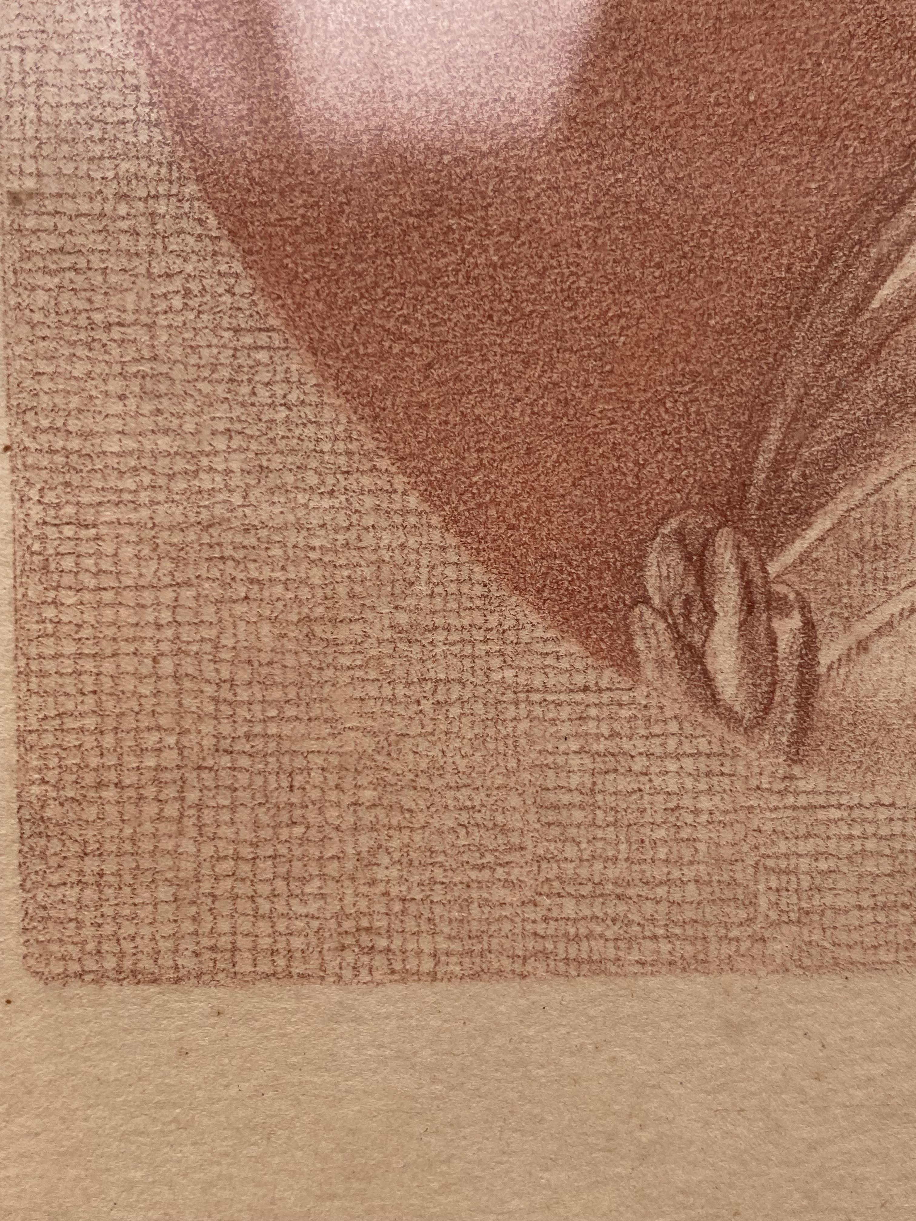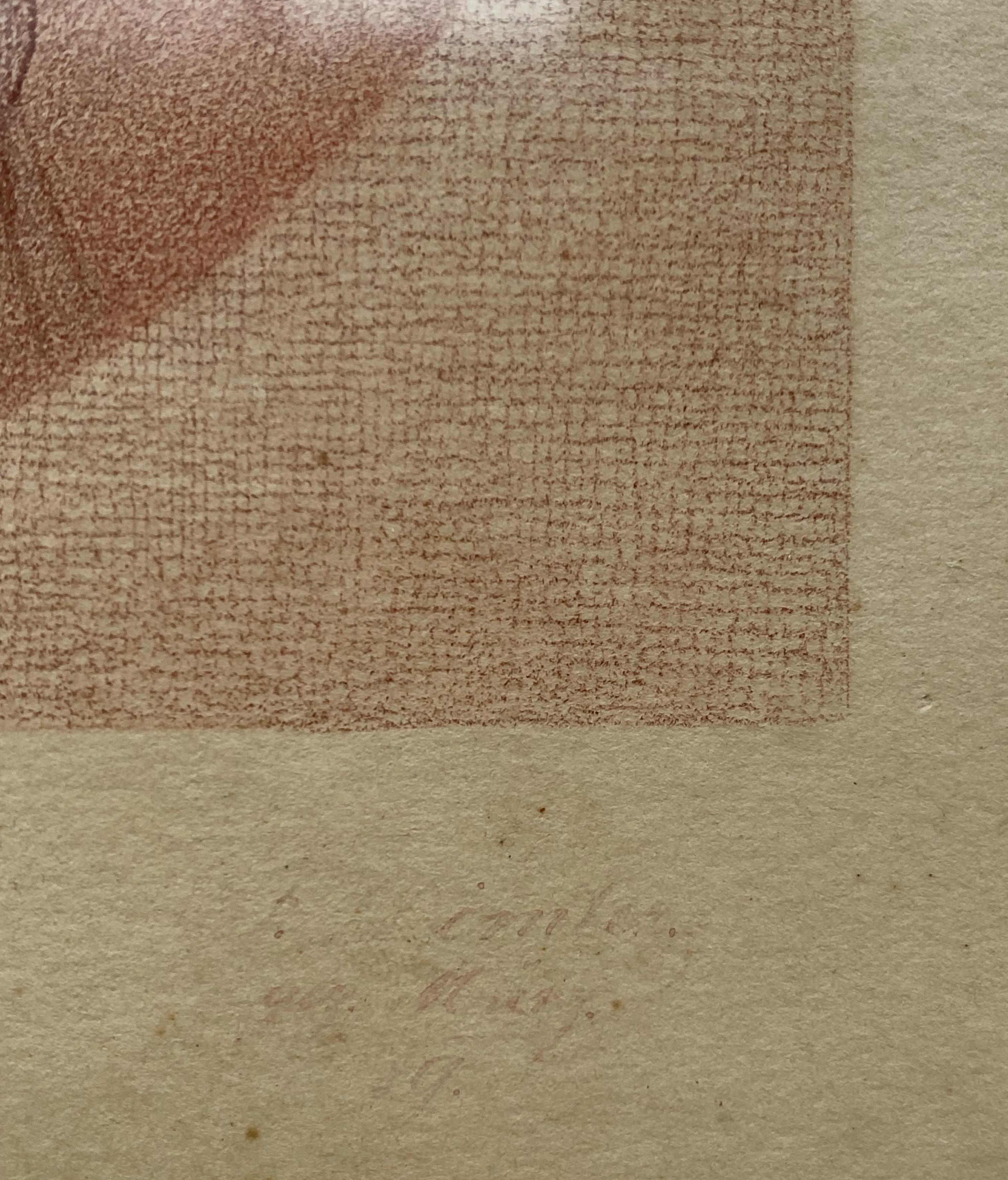 Zeichner des 18. Jahrhunderts: Porträt einer jungen Frau mit hochgesteckter Rokokofrisur und Federhut im Oval umgeben mit feinem quadratischen Gitternetz. Original Rötelstift-Zeichnung in feinster Manier : unten rechts signiert und datiert ‚F. Dimler / gez. März / [17]89‘. süddeutsch (Tübinger Raum), 1789. Bildformat 17 x 14,5 cm zeitgenössisch um 1800 unter Glas in Goldleiste gerahmt (nicht ausgerahmt), Rahmen mit zwei Absplitterungen, goldene Farbe mit alter Patina, unter dem Glas etwas angeschmutzt, schönes dekoratives Stück,