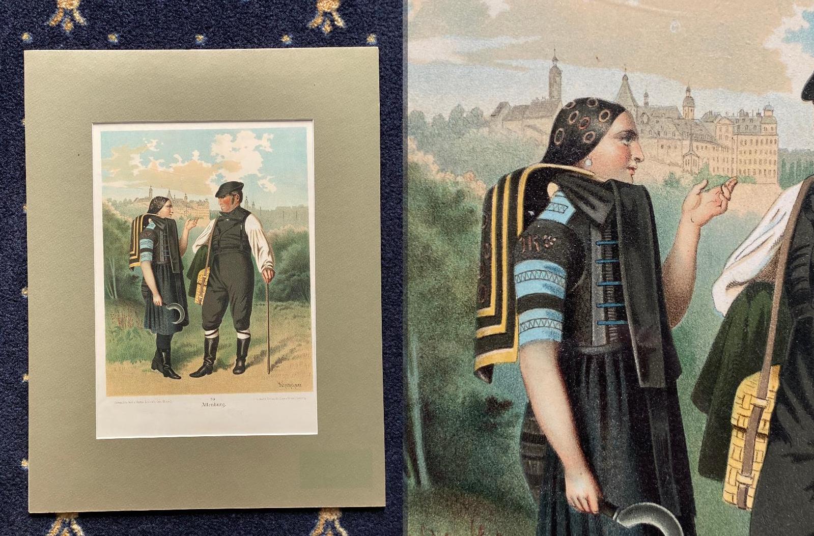 Kretschmer, Albert (1825-1891): Altenburg : Trachtenpaar im Hintergrund Schloss Altenburg : Chromolithographie : Blatt 20 aus ‚Deutsche Volkstrachten‘. Leipzig, J. G. Bach, 1890. 25 x 20 cm (Bildgröße) unter Passepartout 44 x 34 cm,