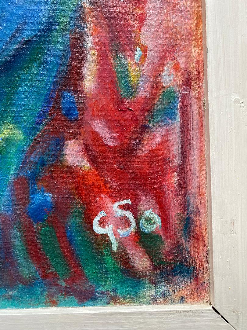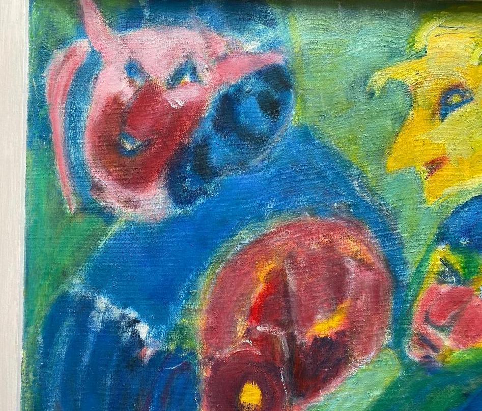 Sorger, Gerda (1924-2022 Riedlingen). – ‚Missgunst‘ : Figurengruppe in für die Künstlerin typischer kräftiger Farbigkeit. Öl auf Leinwand in weiss lackiertem Aterlier-Rahmen : unten rechts signiert, rückseitig bezeichnet, signiert und datiert, sowie Klebezettel. (Inventarnummer 182, Atelierpreis DM 1800.–) Riedlingen, 1981. Aussenmasse 82 x 79 cm, prächtiges Werk der Riedlinger ‚Grande Dame‘, die das Leben und kräftige Farben liebte.–