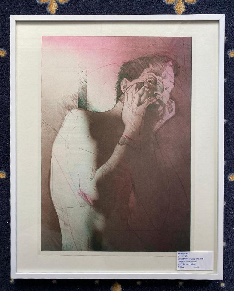 Beck, Stephan: ‚o. T.‘ Zinkographie für Spektrum Nr. 96 ‚Nachtmar/Alptraum‘’, rückseitig bedruckt wie erschienen, unsigniert. Zürich, 1982. Bildformat 44 x 31 cm säurefrei auf Trägerkarton montiert, wohnfertig gerahmt in weisser Aluleiste (50 x 40 cm),