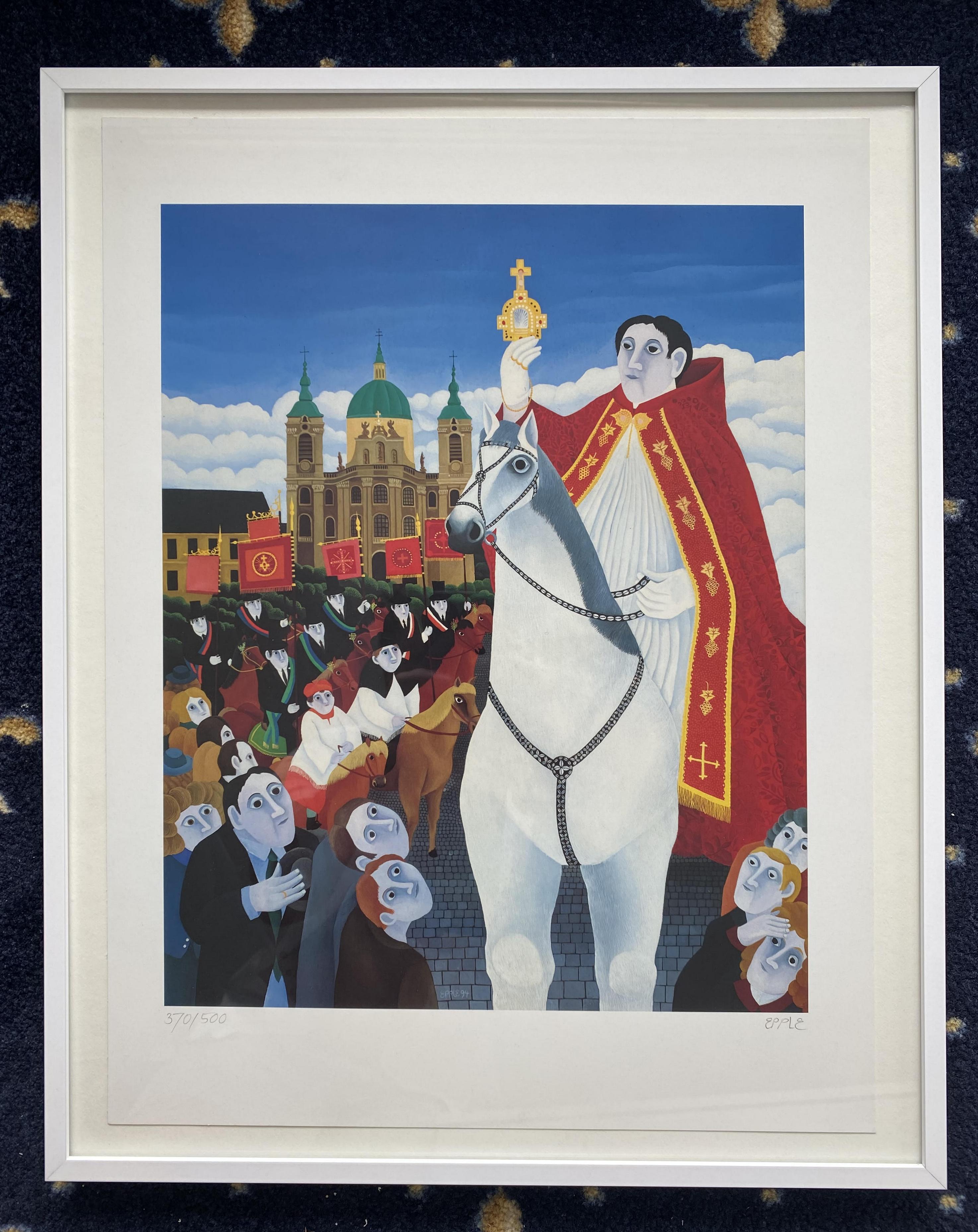 Epple, Bruno (1931 – 2023): ‚Weingartener Blutritt‘ : vor der Basilika präsentiert der Reiter die Monstranz den Gläubigen : am unteren Bildrand numeriert 370/500 und handsigniert. Offset säurefrei auf Trägerkarton montiert. Friedrichshafen, Robert Gessler (Druck), 1994. 37 x30 cm (Bildgröße), in hochwertigem weissen Nielsen Alurahmen wohnfertig gerahmt 50 x 40 cm,
