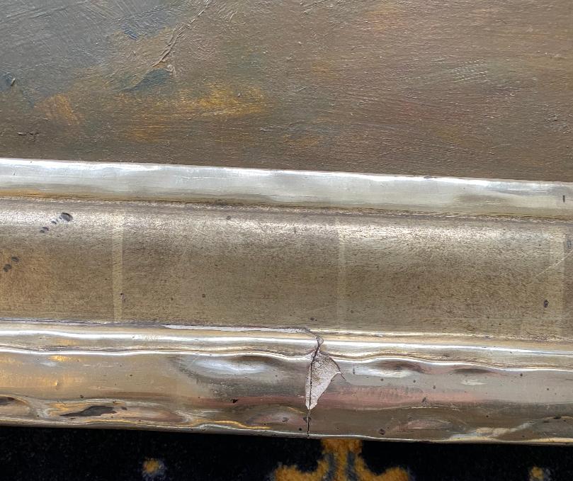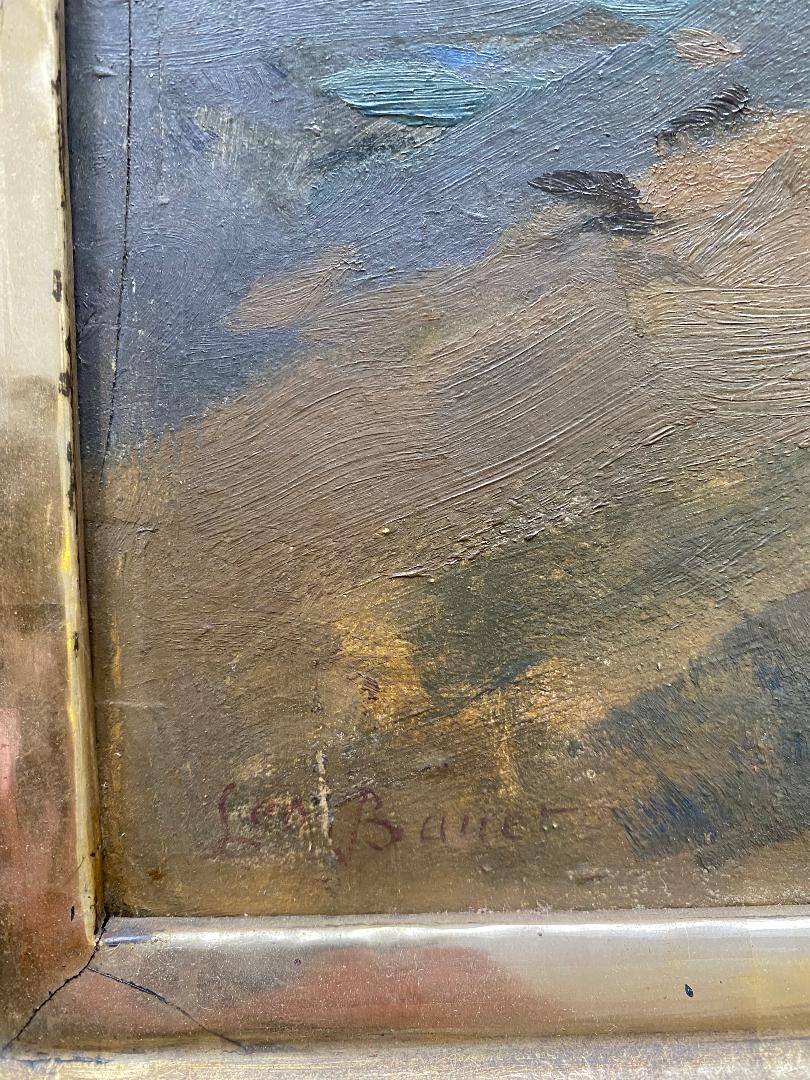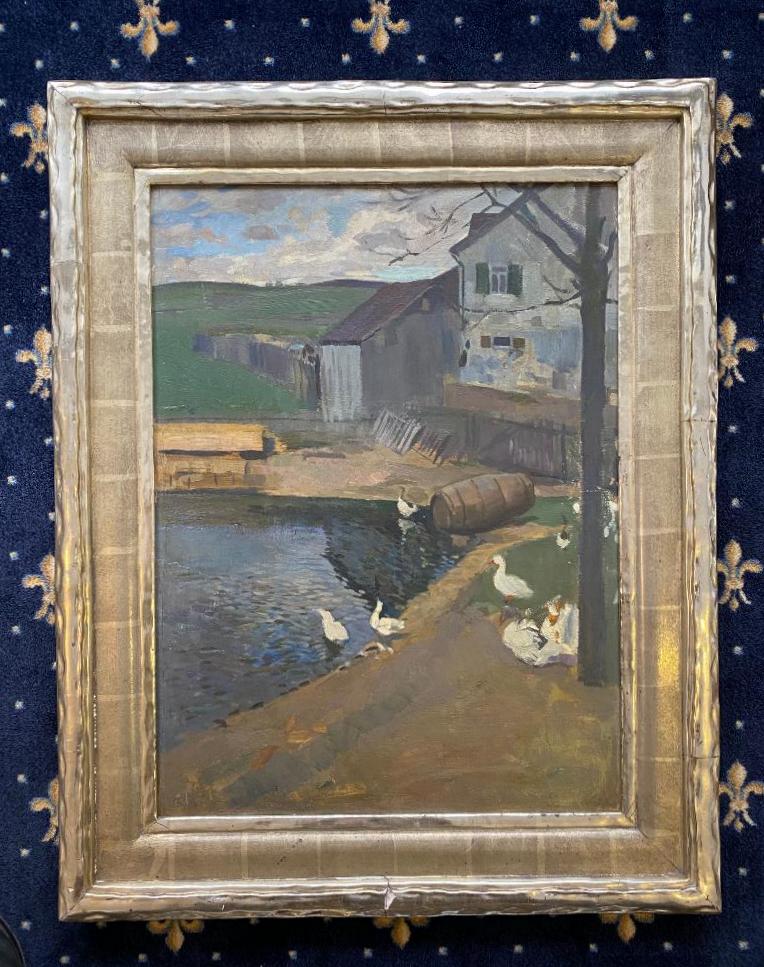 Bauer, Leo (1872 Münstertal/Badeb – 1960 Stuttgart): ‚Gänse am Weiher‘ : Enten am Teich vor idyllischer Bauernhofkullisse : großformatiges Ölgemälde auf Malpappe, unten links signiert, im Prunkrahmen, 1. Drittel 20. Jh., sichtbare Bildgröße 67 x 50 cm, im goldenen Prunkrahmen, 87 x 70 cm, nicht ausgerahmt, Bild mit wenigen kleinen Bereibungen, Rahmen fußseitig bestossen/verletzt, * Lit. Nagel S. 19.– Thieme/Becker III, 70.– Studium an der Akademie Karlsruhe und Stuttgart bei Grünenwald, Haug, Igler, Keller und Schraudoph.– bekannt vor allem für seine Stimmungsbilder von der Schwäbischen Alb.–