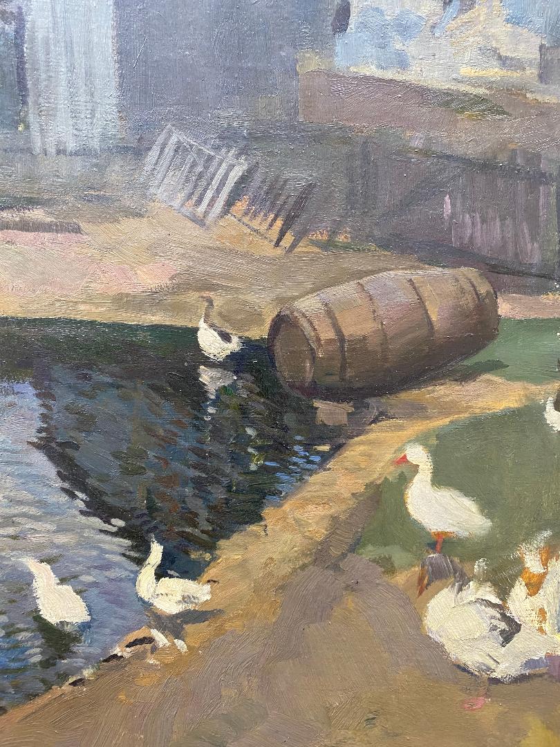 Bauer, 'Gänse am Weiher' : Enten am Teich vor idyllischer Bauernhofkullisse :