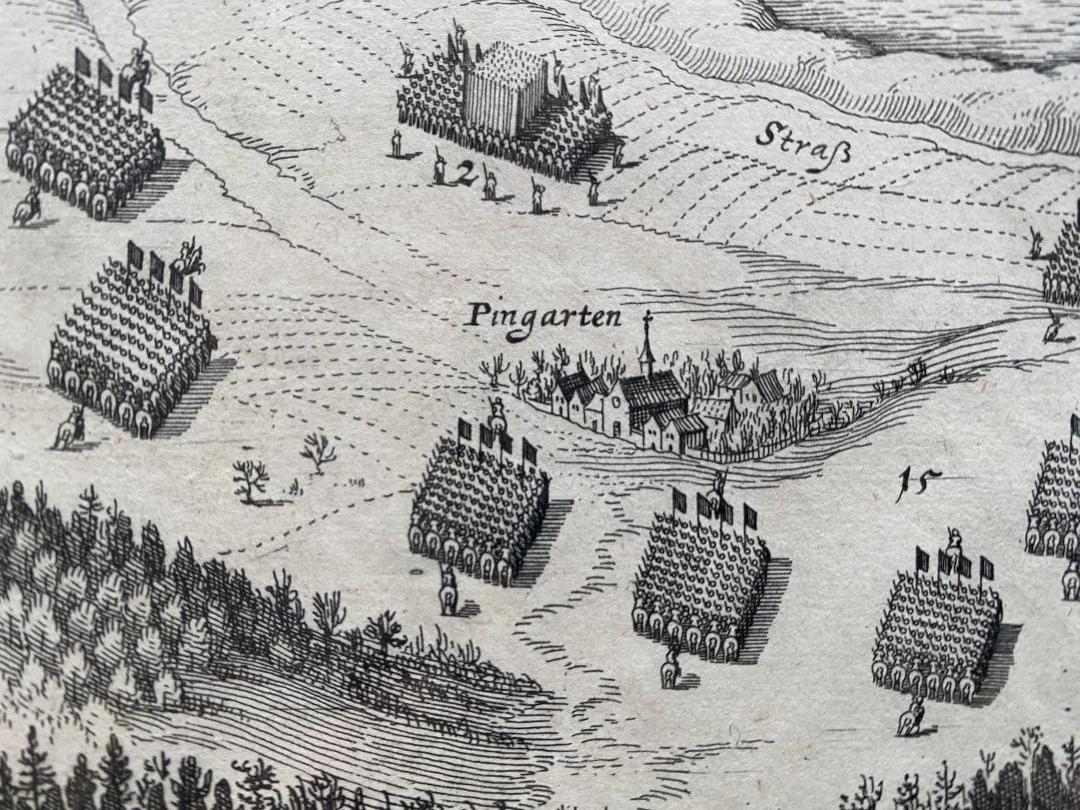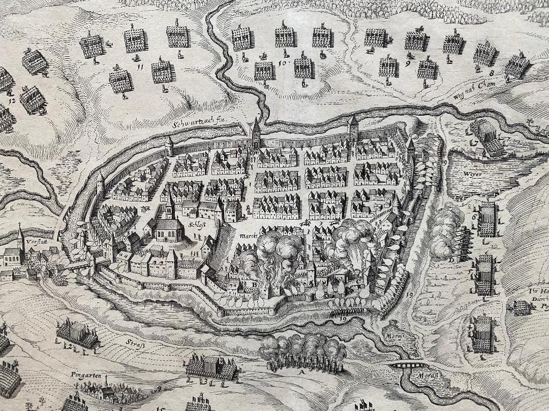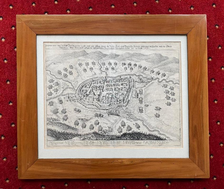 Neunburg vorm Wald (Oberpfalz). – ‚Delineatio der Statt Newburg am waldt und wie selbige durch die Röm. Kay. und Bayrische Armata umbringt beschossen und der Obriste Schlange sampt denen darinn gelegenen Schwedischen Regimentern sich ergeben müssen den 21 Marty 1641‘ : Detailreicher Blick auf die von gegnerischen Formationen umzingelte Stadt aus der Vogelschau : oben Titel unten Legende 1 – 19 und A – C. Kupferstich von Merian aus Theatrum Europaeum, gezeichnet vom kaiserl. Ing. Carlo Cappi, [Frankfurt/M], Matthäus Merian, [1645]. Platte 28 x 36 cm, unter Passepartout in breiter polierter Biedermeier-Kirschholzleiste wohnfertig gerahmt 43 x 50 cm, Rahmen fussseitig mit kleiner Bestossung, Schlacht 21. März 1641 : Sieg der Kaiserliche Truppen unter Erzherzog Leopold und der Bayerischen Armee General Franz von Mercy besiegen die schwedische Nachhut bei Neunburg vorm Wald.–