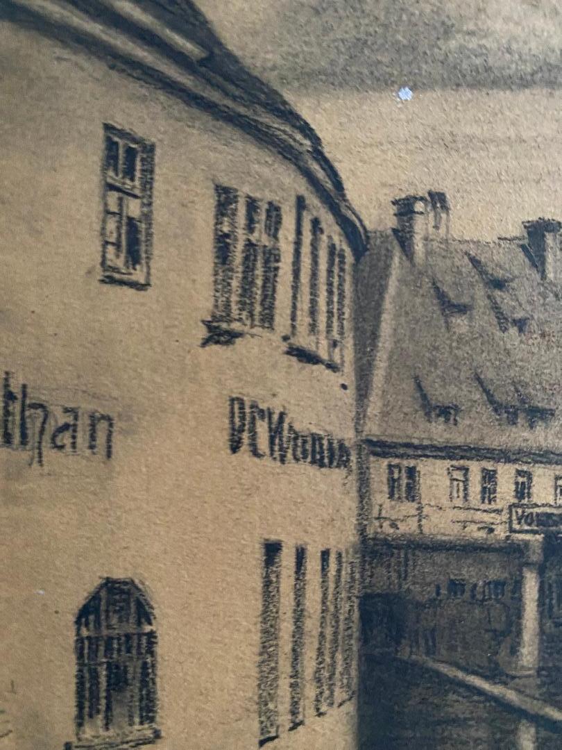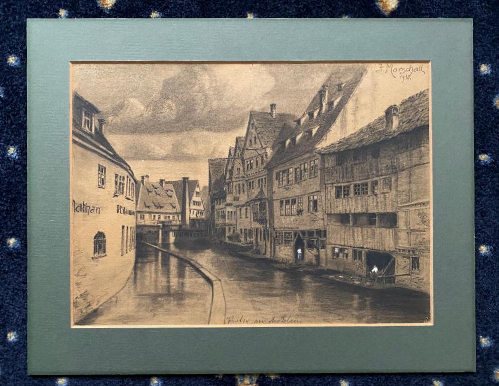 Ulm. – Marschall, Joseph (1887 – 1917). – ‚Ulm – Parie an der Blau‘ : idyllische Vedute der mittelalterlichen Stadt, Personen weiss gehöht : Original-Bleistiftzeichnung : oben rechts handsigniert und datiert 1910, unten bezeichnet, rückseitig Informationen : Ulm, 1910. Bildausschnitt 23 x 32 cm, unter Passepartout 32 x 40 cm, schöner Zustand,