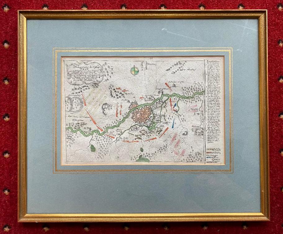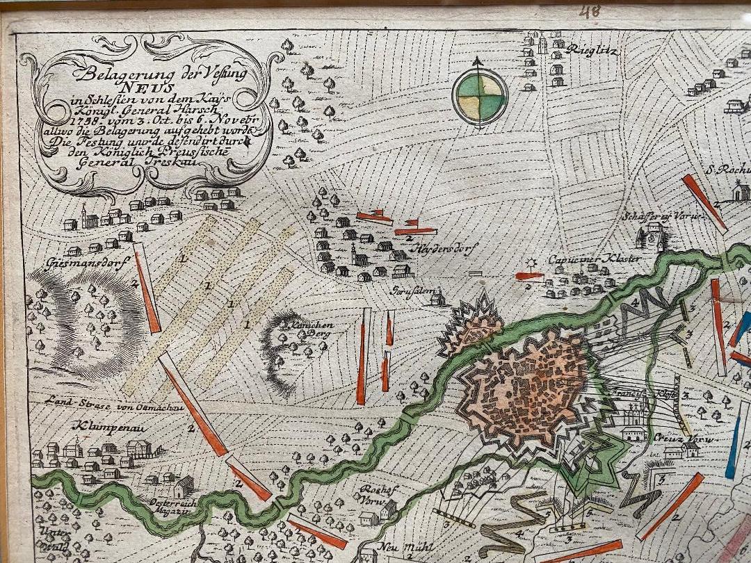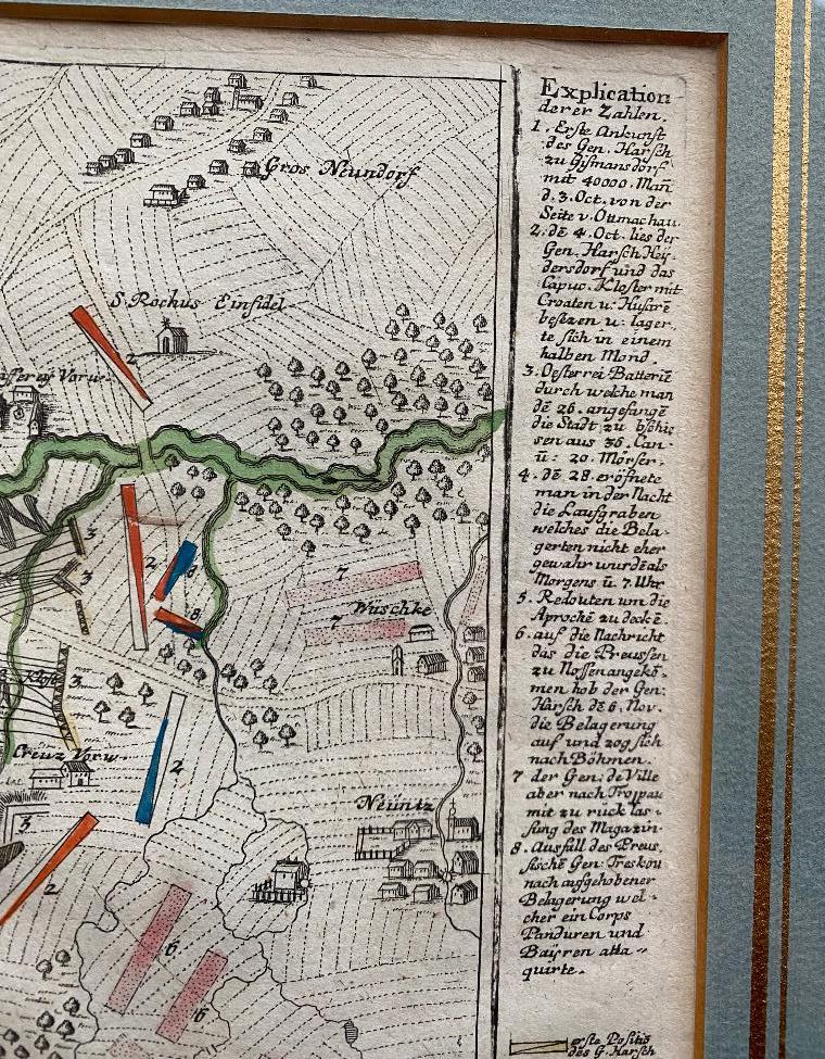 Neisse / Nysa. – ‚Belagerung der Festung Neus in Schlesien von dem Kays. Königl. General Harsch 1758 vom 3. Oct. bis 6. Novebr. allwo die Belagerung aufgehebt worde. Die Festung wurde defendirt durch den Könglich Preussischen General Treskau‘ : Detailreicher Plan der gegnerischen Formationen, mittig Festungsplan der Stadt Neisse mit den umgebenden Dörfern. Rechts Erklärungen 1 – 8, sowie Legende der Farben. Kupferstich von Kilian aus Kriegsatlas oder Schaubühne des teutschen Krieges in den Jahren 1756 bis auf den zu Hubertusburg geschlossenen Frieden 1763’ : Augsburg, [um 1765]. Platte 17 x 25 cm, unter hochwertigem Passepartout, in Goldleiste wohnfertig gerahmt 33 x 38 cm, schönes gepflegtes Exemplar, Belagerung von Neisse 1758 durch die Österreicher im Siebenjährigen Krieg.–
