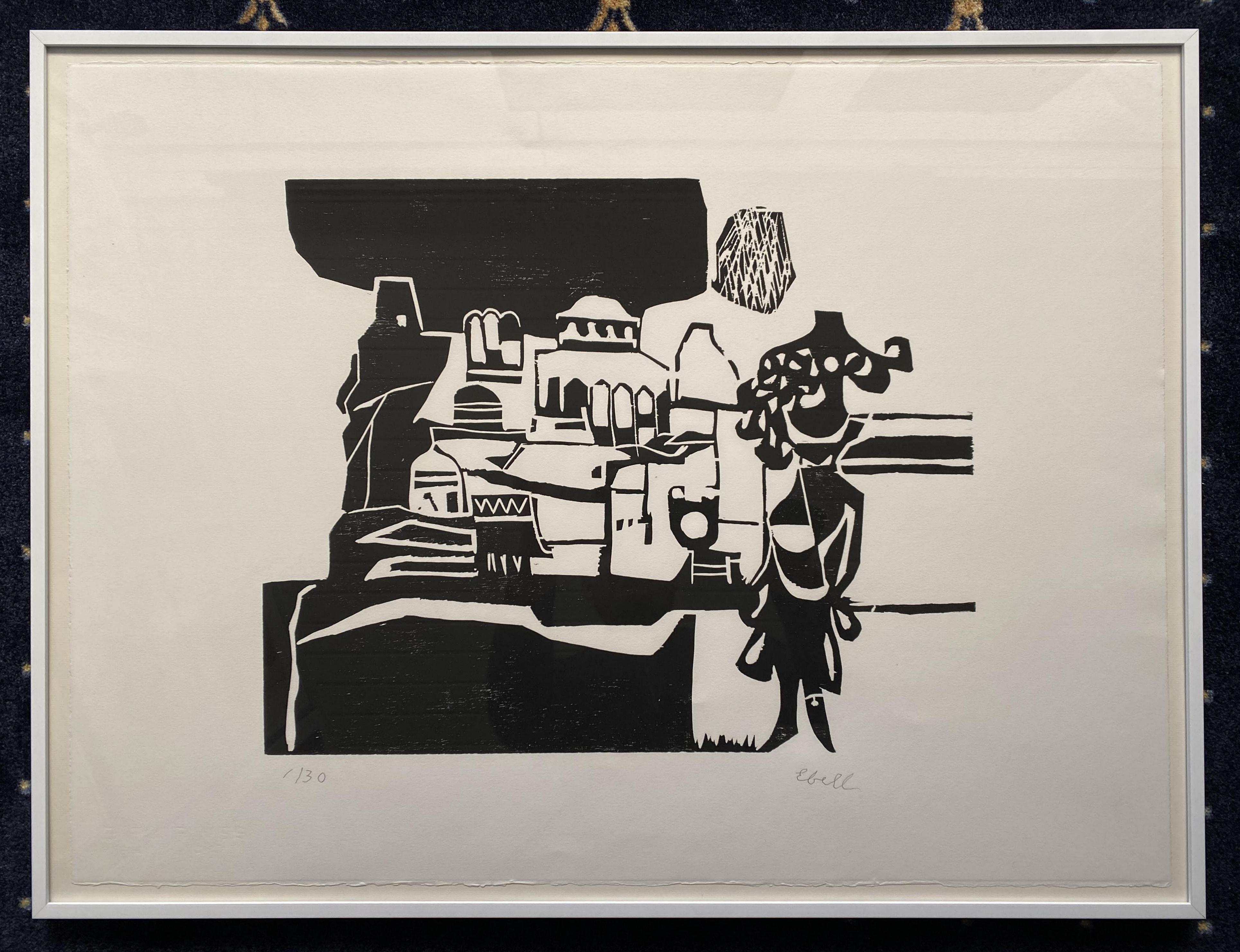 Ebell, Paul Heinrich (1908 Berlin – 1998 Bad Waldsee). – ‚Weisse Stadt‘ : großformatiger Holzschnitt auf BFK Rieves : Handdruck : mit Bleistift numeriert 4/30 und handsigniert. Bad Waldsee, um 1970. Blattformat 57 x 76 cm auf Karton säurefrei reversibel punkt-montiert, wohnfertig gerahmt in weiss lackierten Alurahmen 60 x 80 cm, tadelloses Blatt, * Nagel, Schwäbisches Künstlerlexikon; 35.– Wirth, Kunst im deutschen Südwesten von 1945 bis zur Gegenwart; auf Wunsch wohnfertig gerahmt in weiss lackierten Alurahmen 60 x 80 cm + 60,00