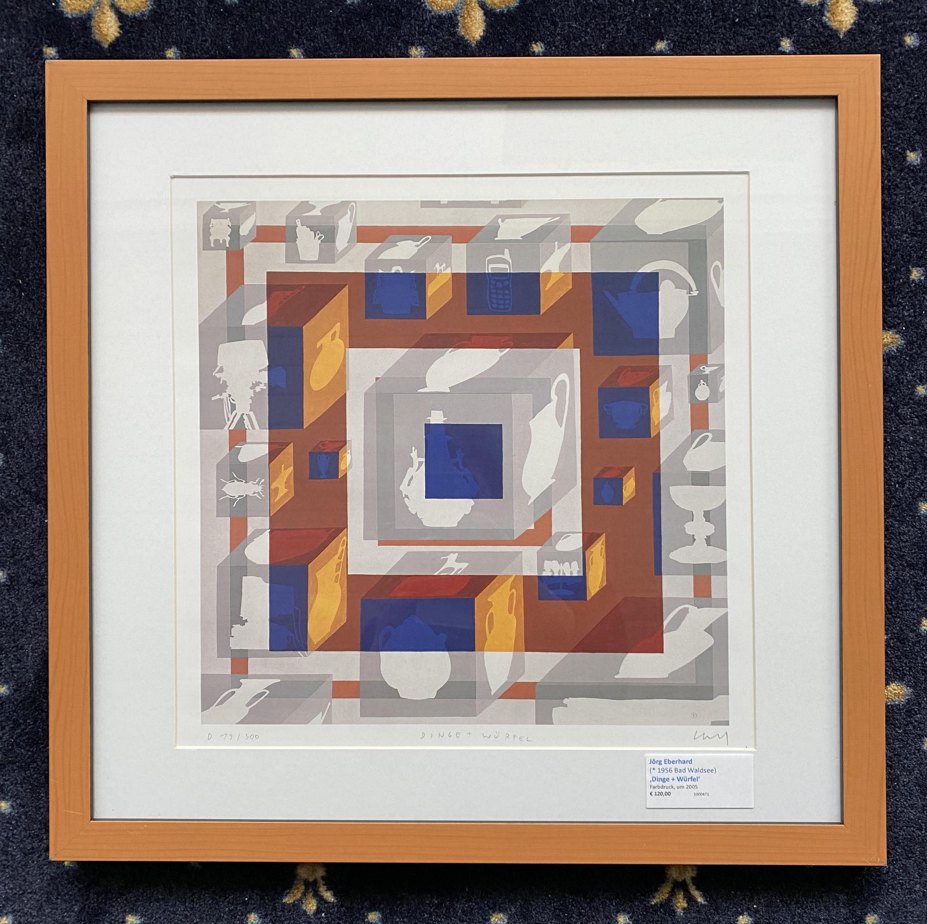 Eberhard, Jörg (*1956 Bad Waldsee): ‚Dinge + Würfel‘ : Farbdruck : nummeriert D19/300, bezeichnet und handsigniert : um 2005. 36 x 36 cm (Bildgröße), unter Passepartout in modernem Holzrahmen 55 x 55 cm, 1975-82 Studium an der KA Düsseldorf bei Wintersberger, Götz und Hüppi, Kunstgeschichte bei Walter Hoffmann und Werner Spiess.–