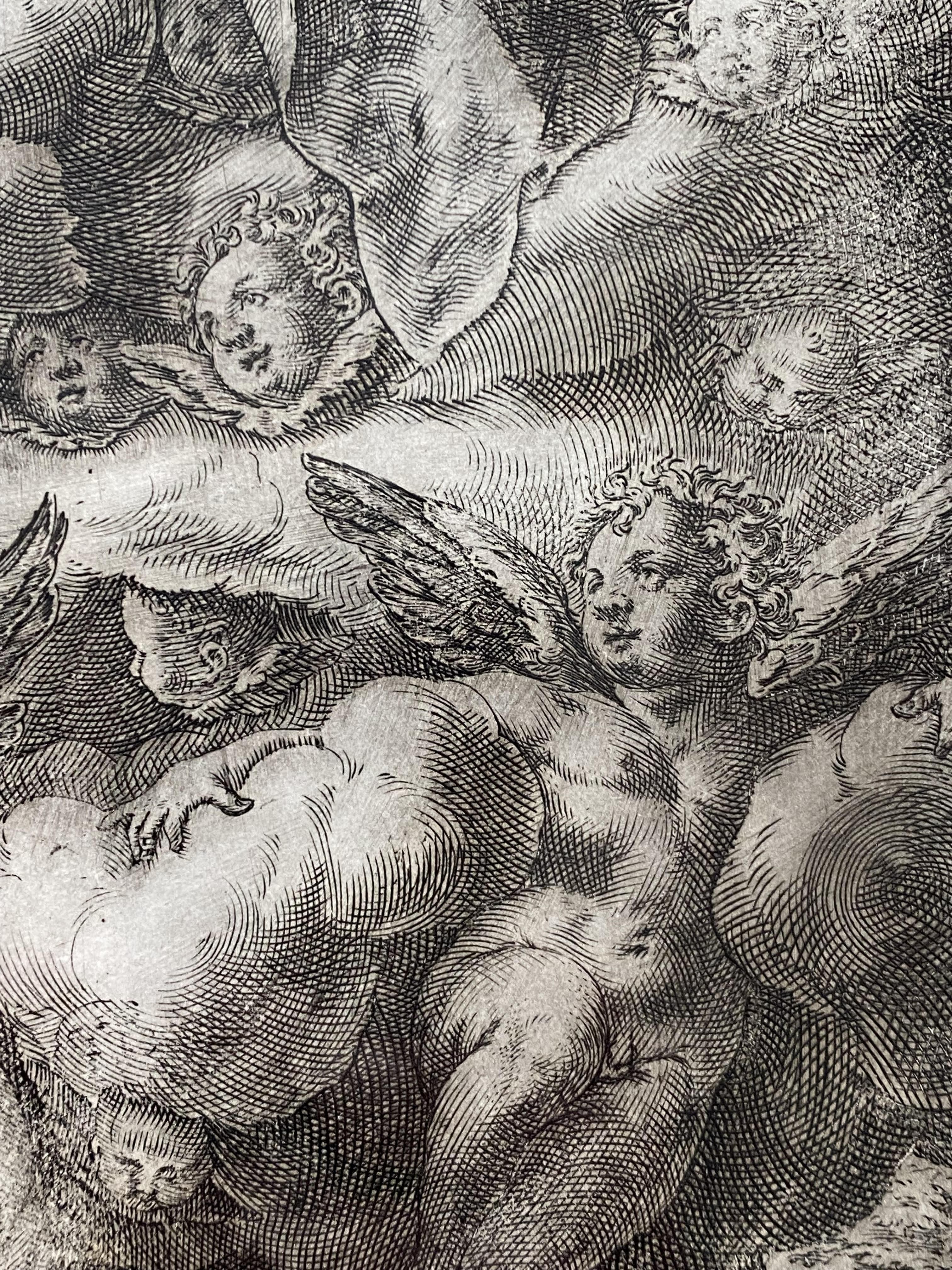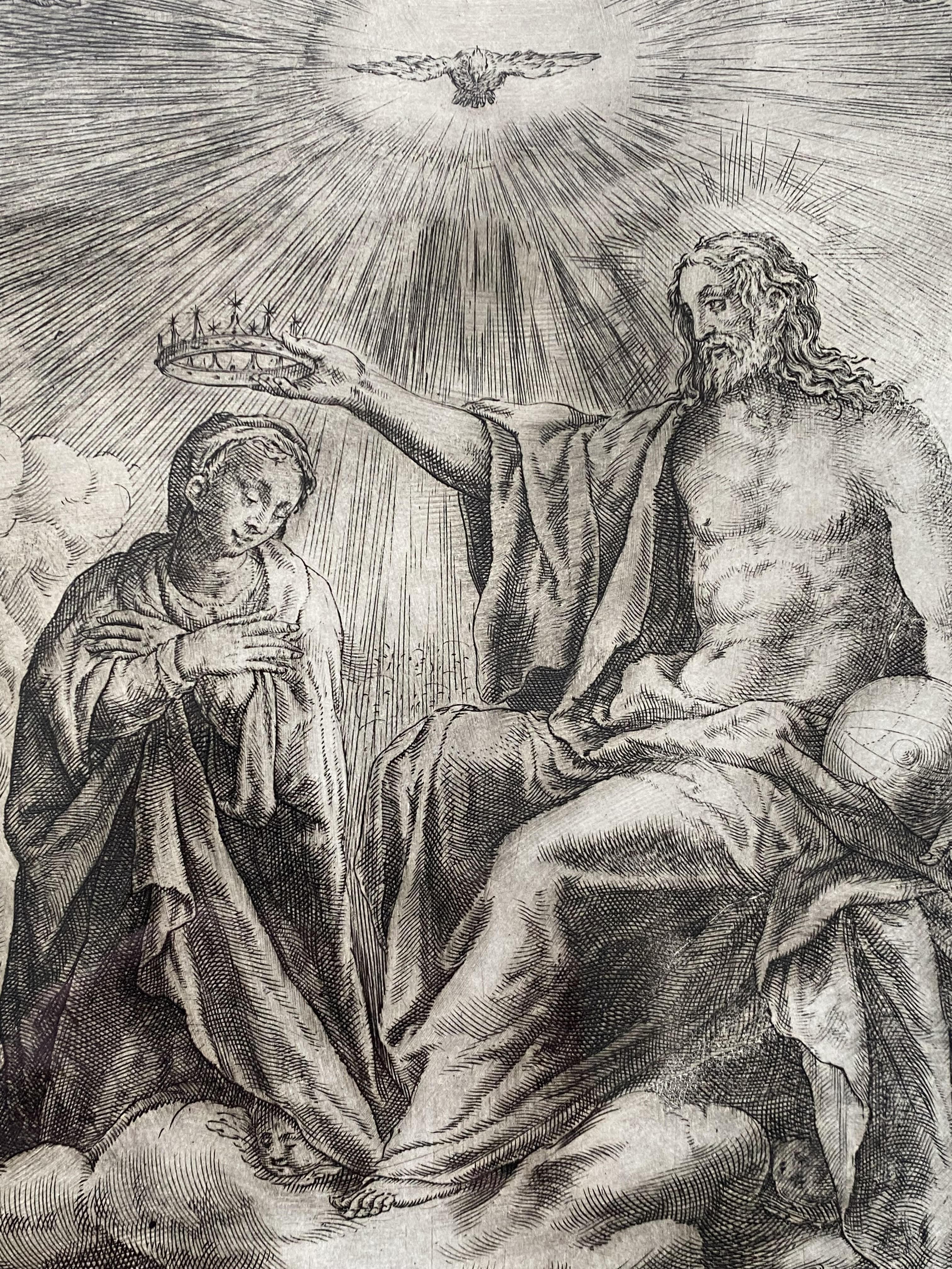 Alberti, Cherubino (1553 Borgo San Sepolcro – 1615 Rom): ‚Incoronazione della Vergine : Krönung Mariens‘ : Krönung Mariens umgeben von Engelsscharen darüber der Heilige Geist in Gestalt der lichtumfluteten Taube : monogrammiert CAB und datiert 1572, links unten bezeichnet Federicus Zuccarus inventor, rechts ‚cum privilegio summi Pontificis‘ : Kupferstich nach Motiv von Federico Zuccari (1543-1609), Rom, 1572. Platte 382 x 265 mm, gerahmt unter Passepartout in Goldleiste 60 x 46 cm, (nicht ausgerahmt), sauber und gepflegt, *Le Blanc, 40.– TIB 34/17.–