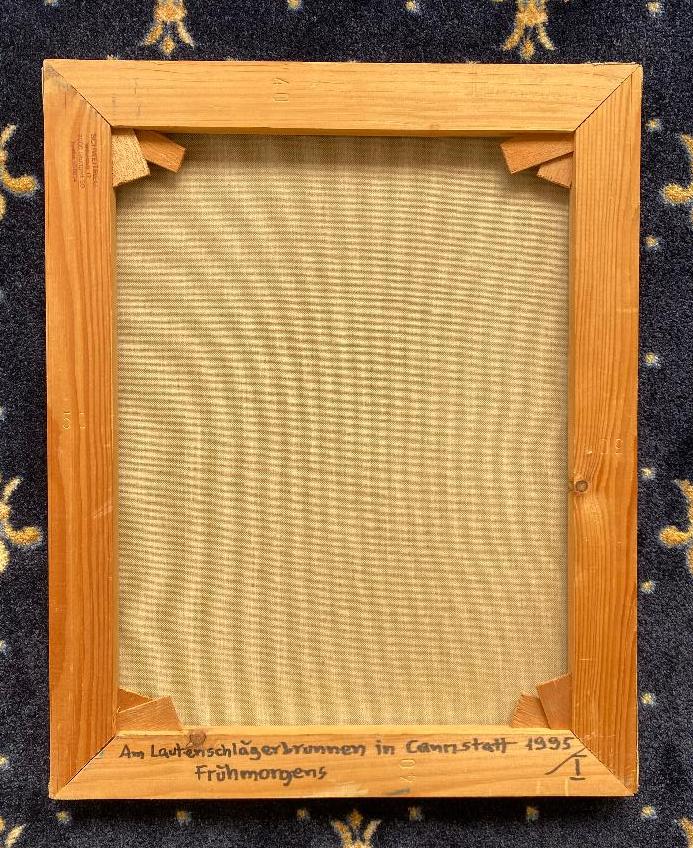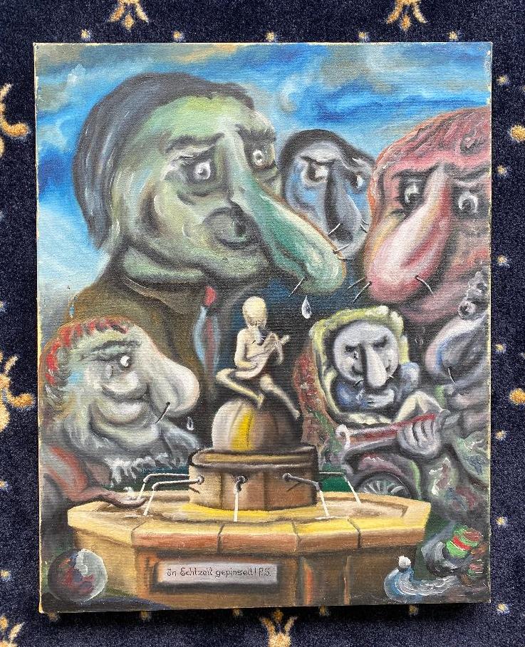 Schweitrieg, Peter ‚Am Lautenschlägerbrunnen in Cannstatt – Frühmorgens : in Echtzeit gepinselt‘ : detailreiche Szene von Naslingen beim Ausflug : farbenfrohes Acryl auf Leinwand, rückseitig bezeichnet und datiert : 1995. Bildgröße 50 x 40 cm, ungerahmt, aus dem Nachlaß von Peter Schweitrieg – Comic- und Satirekünstler – der illustrierte Bücher entwarf, die leider nie einen Verlag fanden.–