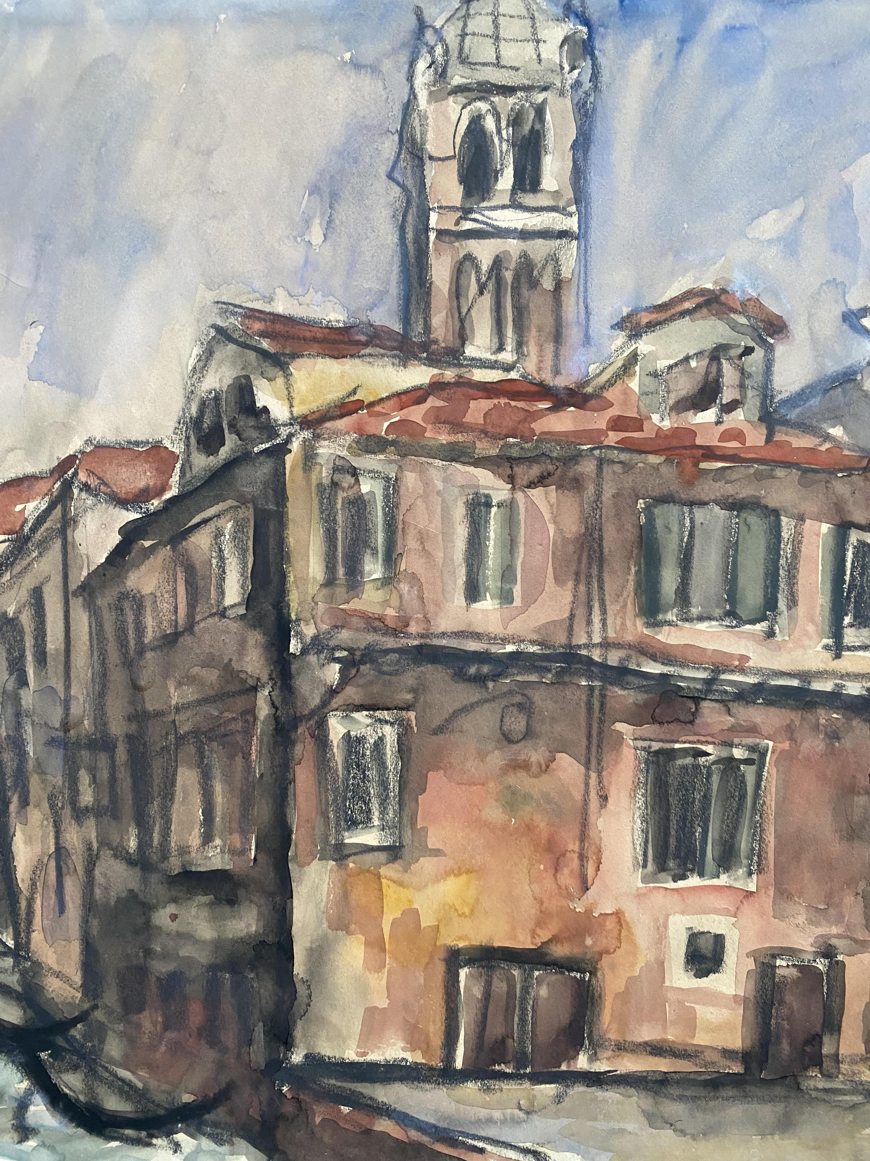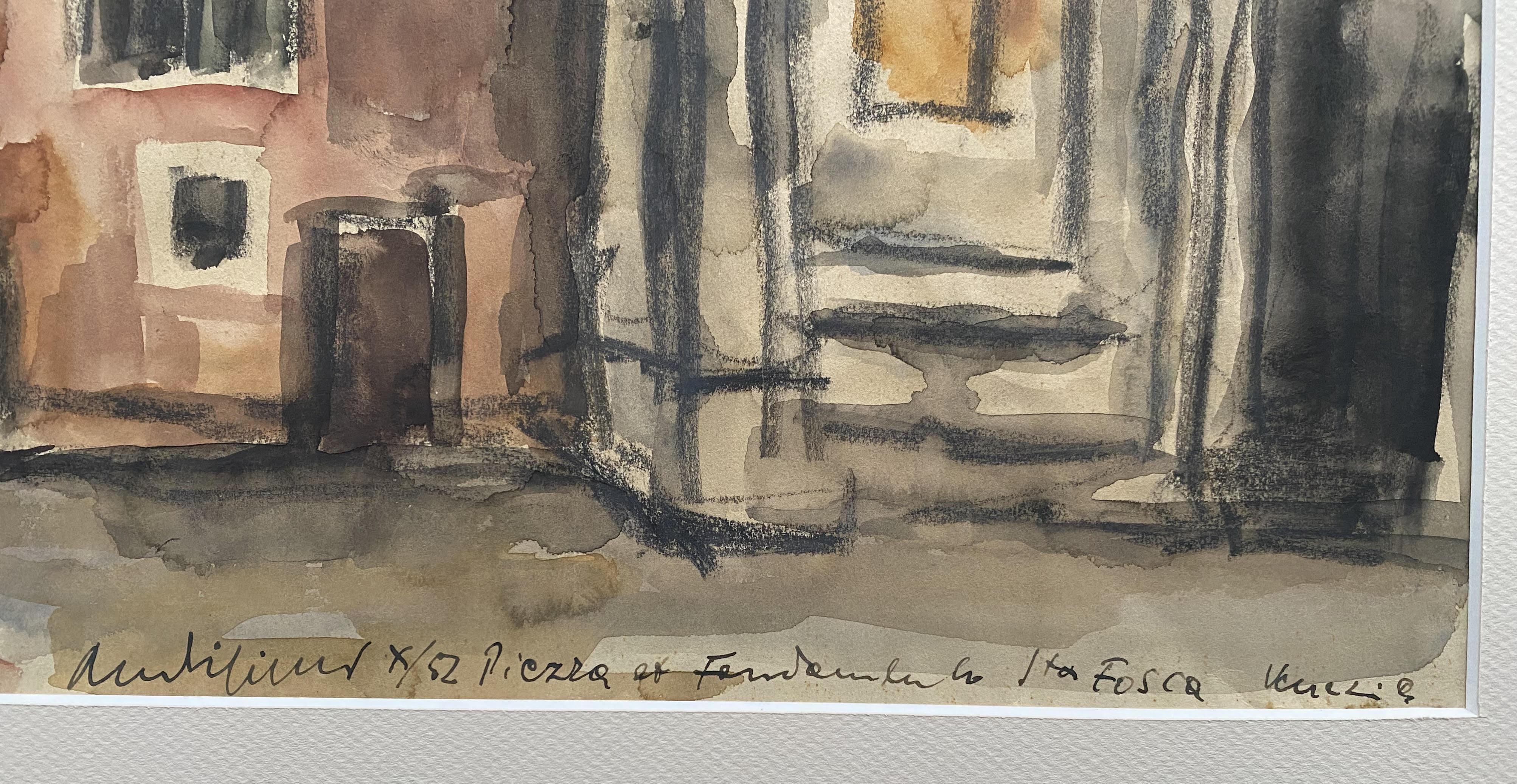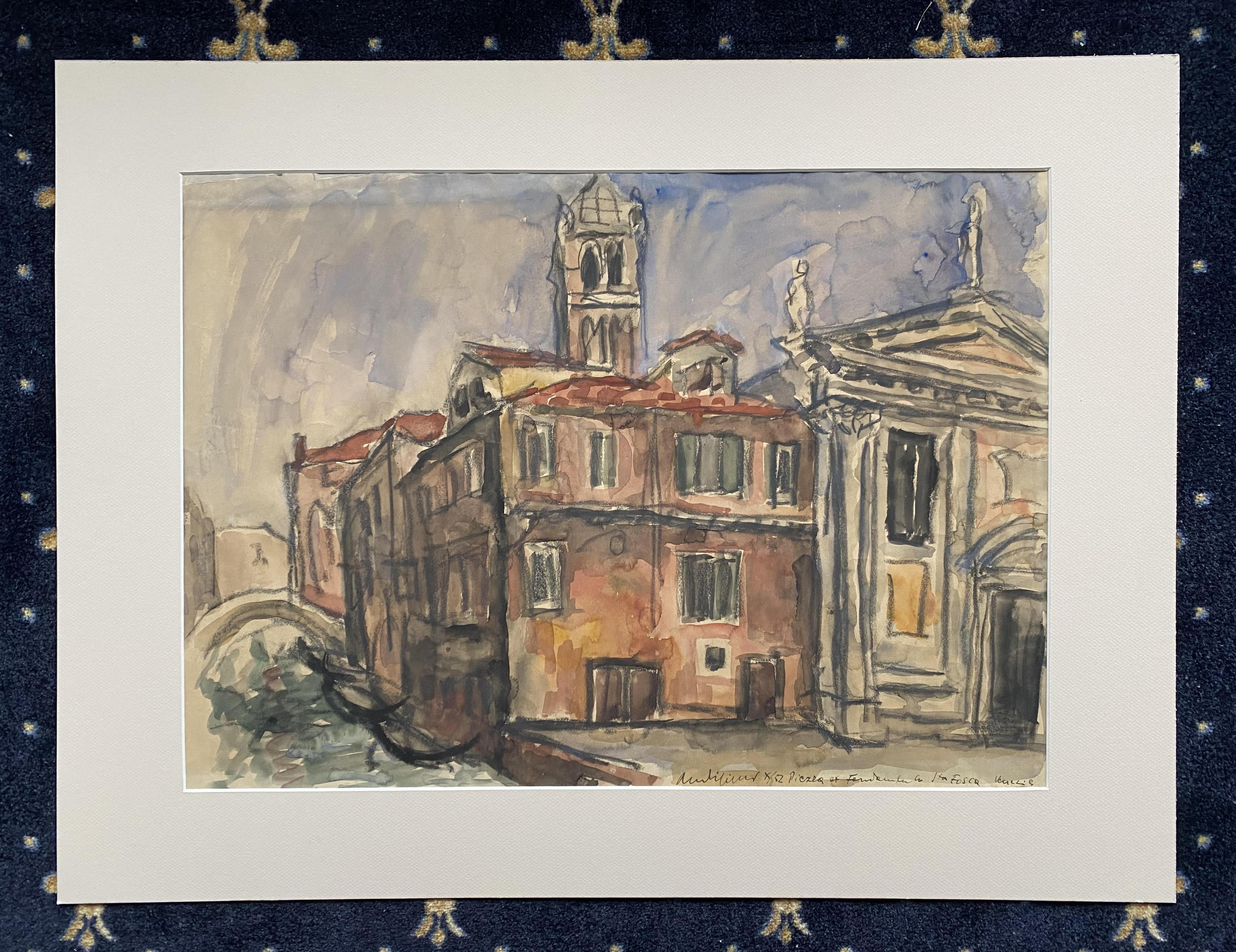 Ficus, Andre (1919 Berlin – 1999 Friedrichshafen). – ’Ansicht von der Ponte Santa Fosca auf die Chiesa di Santa Fosca, den Rio de Santa Foca aufwärts zur Ponte Vendramin : Mischtechnik: Kohle und Aquarelle in gedämpfter Farbigkeit, unten mit Tinte bezeichnet, handsigniert und datiert X, 52 : Venedig, Oktober 1952. sichtbares Bildformat 44 x 61 cm, unter getöntem Passepartout 60 x 80 cm rückseitig Montagespuren,