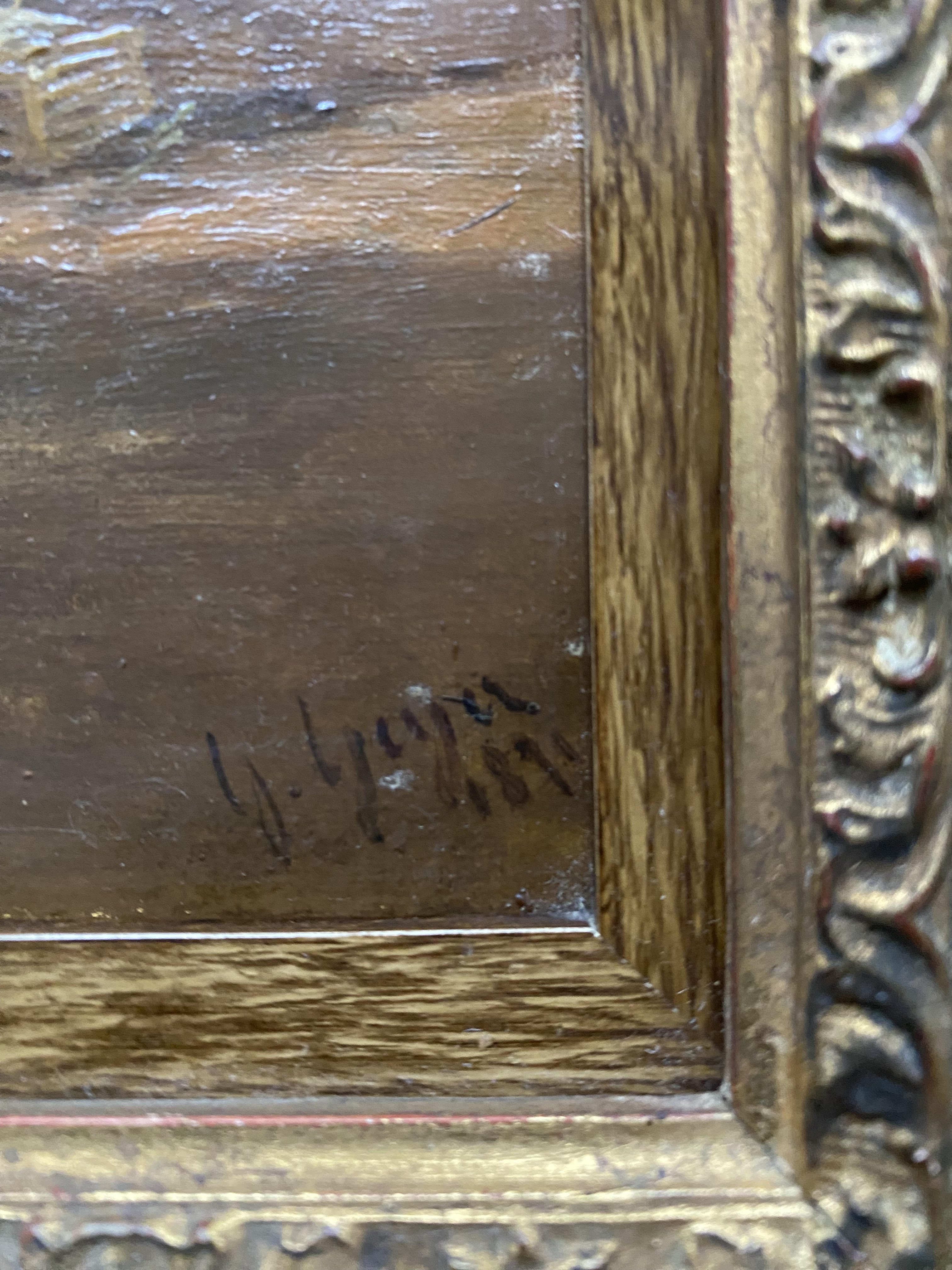 Geyer, Georg (1823 Wien – 1912 Wien): ‚Alte Moschee in Luxor‘ : stimmungsvolle Ansicht eines Platzes mit rastenden Beduinen und Händlern überragt von der Moschee, Palmen, Tempelruinen, orientalischer Lichteinfall : Gemälde auf Leinwand auf Keilrahmen, im Prunkrahmen, unten rechts signiert und datiert 1891 : rückseitig bezeichneter Klebezettel des Künstlers : Luxor, 1891. Bildmasse 42 x 32 cm, Rahmen 59 x 48 cm schöne gepflegte Erhaltung, *Thieme/Becker XIII, 508.– Wurzbach V (1859).– Bötticher I (1891).– österreichischer Landschafter.– Studium an der Wiener Akadmie bei Josef Mössmer, Franz Steinfeld und Thomas Ender.–