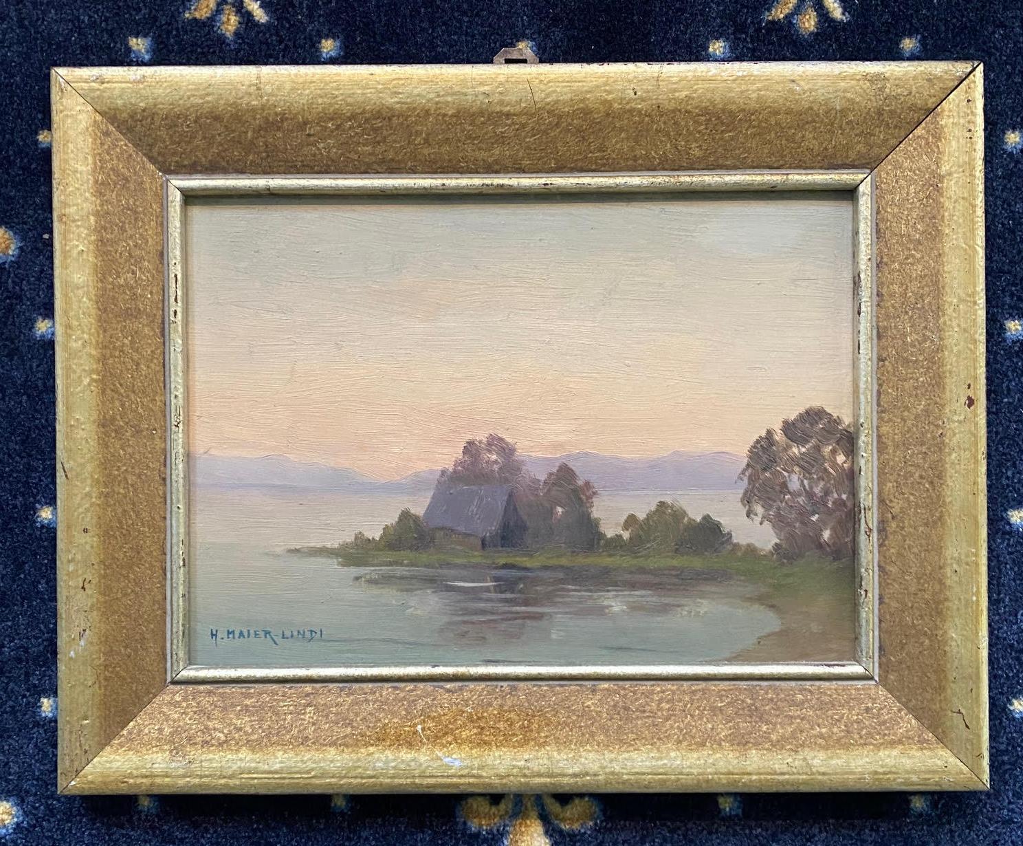 Maier-Lindi, Heinrich (1876 Degerau – 1950 Stuttgart): ’Abendstimmung am Bodensee (Untersee) mit Bootshütte : Ölgemälde auf Karton, unten links signiert, rückseitig bezeichnet auf Klebezettel : [um 1920]. zeitgenössisch gerahmt in breiter Goldleiste,