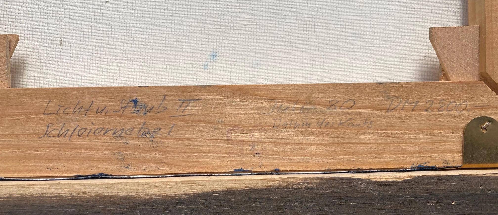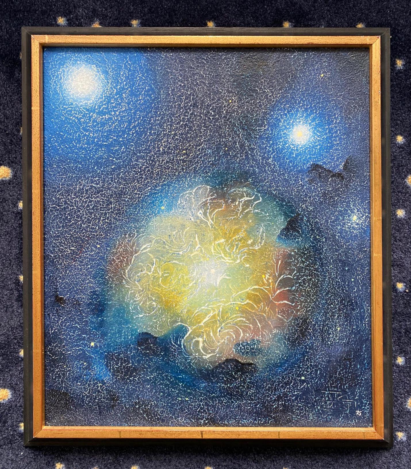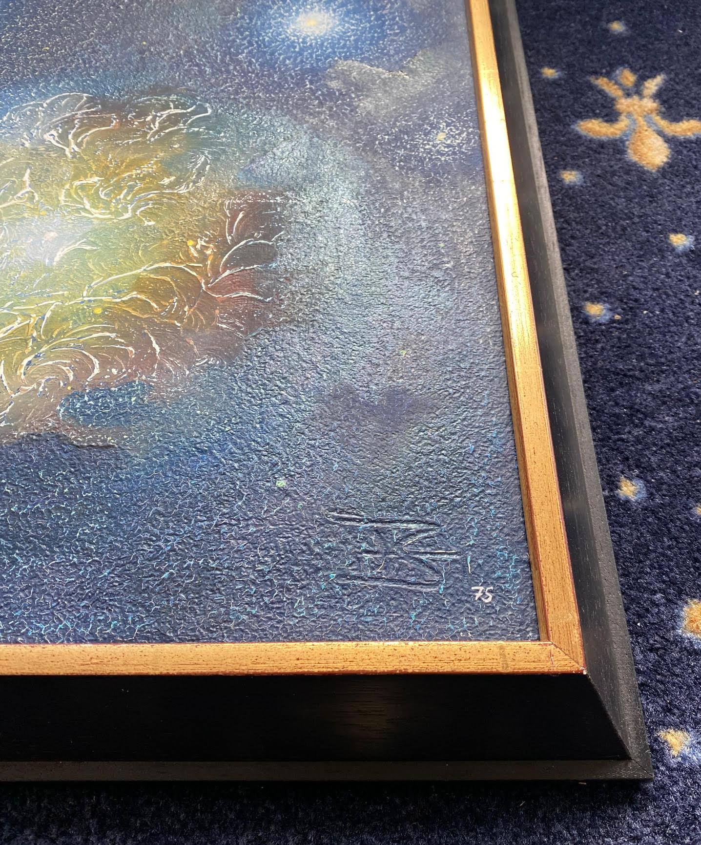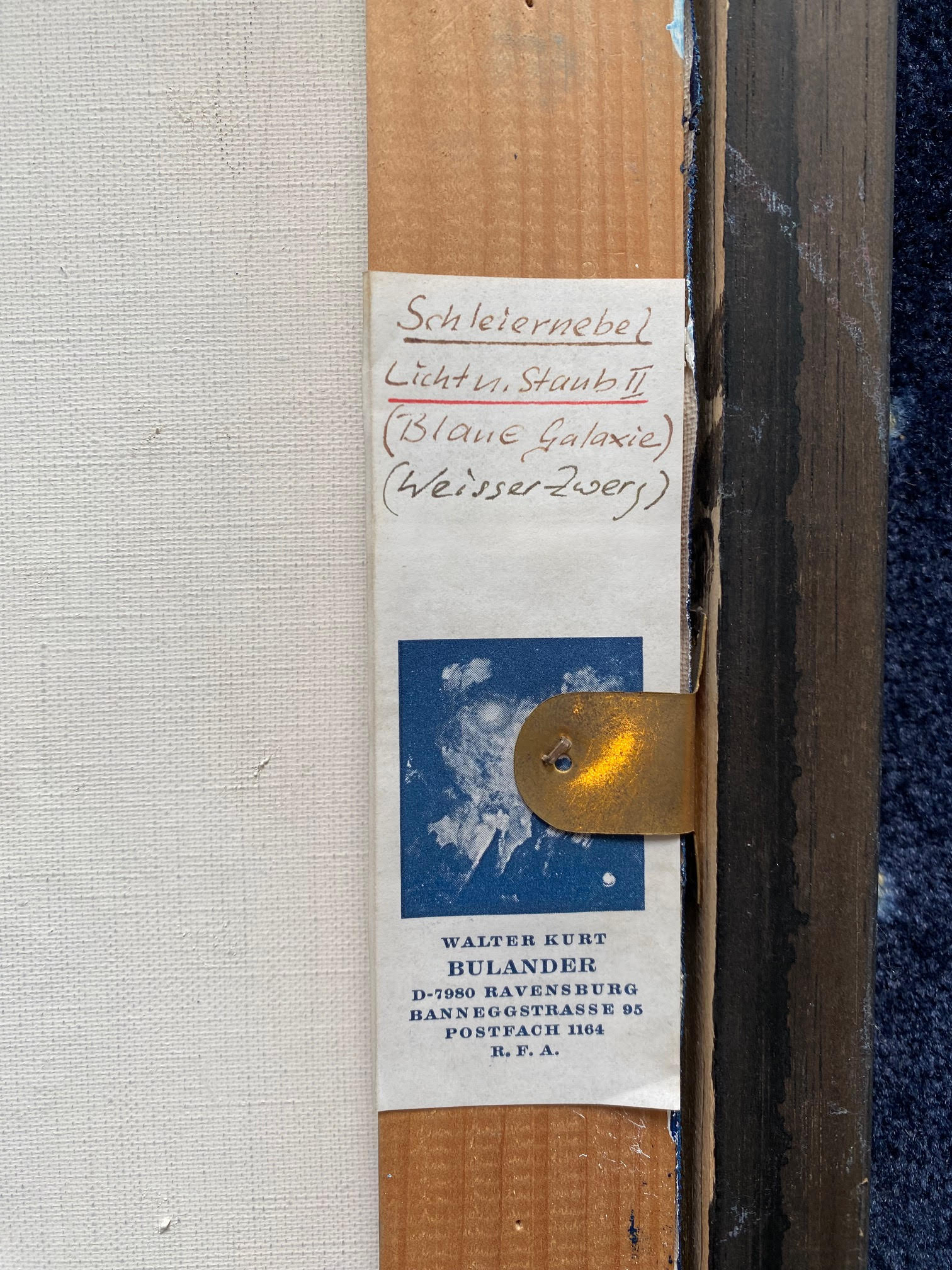 Bulander, Walter Kurt (1937 Altshausen – 1995 Ravensburg – Weissenau): Licht und Staub II – Schleiernebel (Blaue Galaxie – Weisser Zwerg) : Sternennebel in blauem kosmischen Hintergrund, nebulös verstärkt durch starkes Reißlack-Krakelee : unten rechts monogrammiert und datier ’75 : Öl auf Leinwand auf Keilrahmen, Ravensburg, 1975. schwarzer Holzramen mit goldLeiste 45 x 40 cm,