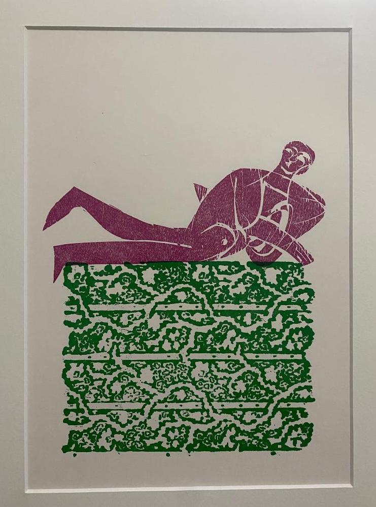 Grieshaber, HAP (1909 Rot a.d. Rot – 1981 Eningen unter Achalm). – ‚Liegender‘ : Holzschnitt grün, violett : aus dem Zyklus ‚Grob, fein & göttlich‘. Bramsche, Gebr. Rasch & Co (Druck), 1970. 28.5 x 19.5 (Holzschnittgröße), unter Passepartout montiert, *Fürst 69/66 unsigniert *** WAHLWEISE WOHNFERTIG GERAHMT +EUR 40,00 ***