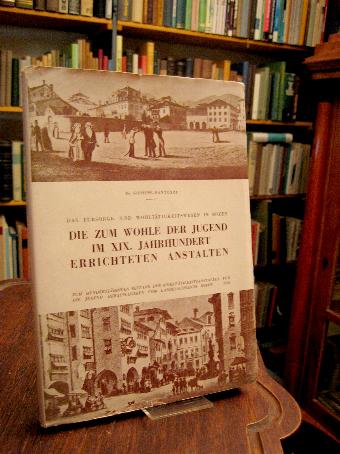 Pantozzi, Giuseppe: Das Fürsorge- und Wohltätigkeitswesen in Bozen : Die zum Wohle der Jugend im XIX.Jahrhundert errichteten Anstalten. Zum Hundertjährigen Bestand der Wohltätigkeitsanstalten für die Jugend herausgegeben vom Landesausschuss Bozen. Aus dem Italienischen (L’assistenza e beneficenza in Bolzano, le Istitutioni erette a pro giiovani nel secolo XIX.) mit Unterstützung des Verfassers übersetzt und bearbeitet von Josef Srobl. Bozen, Verlagsanstalt I.C.A, 1958. gr8°, 235, (3) S., mit 8 Porträttafeln, OKart (Brosch) mit ill OU, Umschlag mit kleinem Einriss, Namensstempel auf Vorsatz, fest und sauber,
