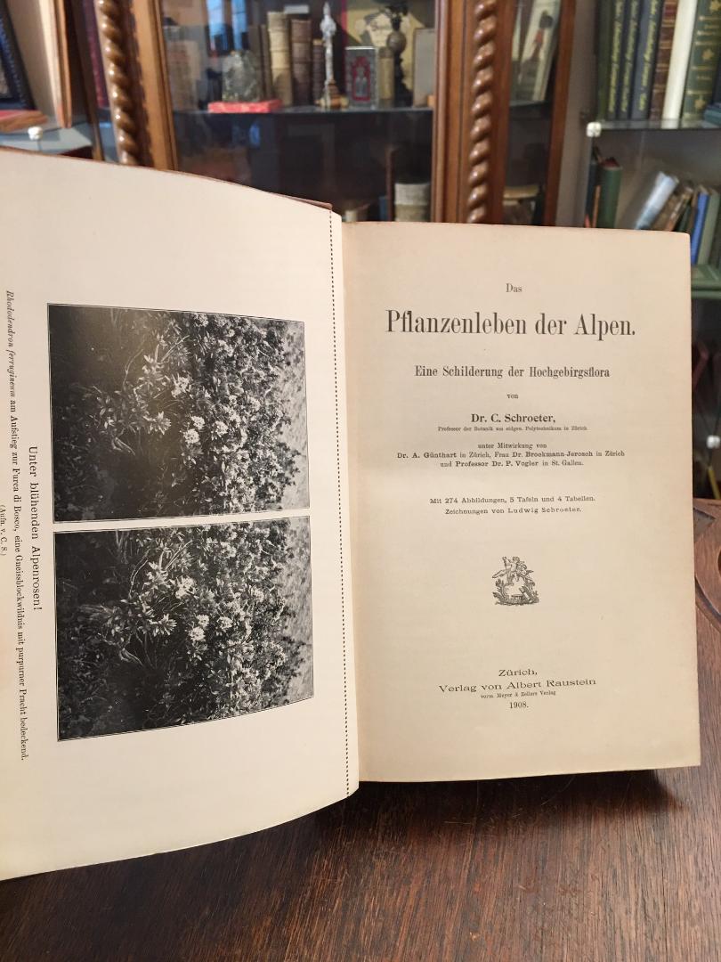 Schroeter, C. [Karl]: Das Pflanzenleben der Alpen : Eine Schilderung der Hochgebirgsflora. Unter Mitwirkung von A.Günthart, Brockmann-Jerosch und P.Vogler. (1. Aufl.), Zürich, Verlag von Albert Raustein (vorm Meyer & Zellers Verlag), 1908. gr8° (24x15), XVI, 806, (2) S., Frontispiz (Stereophotographie ‚Alpenrosen‘ perforiert zum Heraustrennen), mit 274 Abb., 5 Tafeln und 4 Tabellen teils auf gefalteten Karten, OHldr mit JugendstilRPrägung und grossen LdrEcken, marmorSchnitt, Rücken aufgehellt, Exlibris auf Vorsatz, kaum genutzt, schönes gepflegtes Exemplar, aus dem Nachlass des Davoser Photographen und Alpinisten J.Sigrist-Herder.–