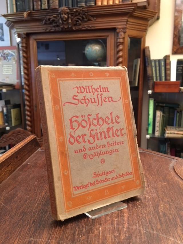 Schussen, Wilhelm [d.i. Wilhelm Frick]: Höschele der Finkler : und andere heitere Erzählungen. 4.-7. Tsd., Stuttgart, Verlag von Strecker und Schröder, 1918. 8° (18x12), (IV), 237 S., OKart (Brosch), Umschlag angestaubt und etwas angerändert, fest und sauber, enthält: Höschele der Finkler.– Häbich und Hohnerlein.– Die schöne Witwe.– Freund Johannes.– Eine Hochzeitsreise.– Der vergiftete Weihnachtsengel.– Der Hund des Dichters.– Vater Gottlieb.– Ein Menschenleben.– Der Kopf ohne Mann.– Krieg am Kanal.– Das Reisegeschenk.– Pilgrime.– Der Schatten Gottes.– Kilian Pfeifer.– Der Genius von Hintermichelswaag.–