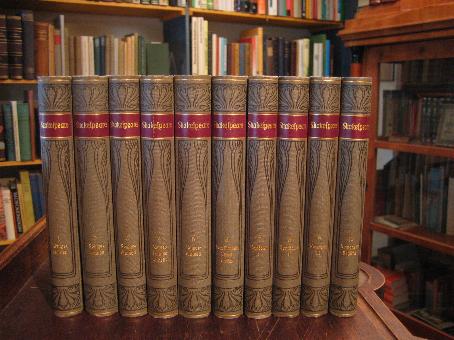 Shakespeare, William (1564-1616). – Brandl, Alois (Hrsg): Shakespeares Dramatische Werke [in zehn Bänden]. Übersetzt von August Wilhelm von Schlegel und Ludwig Tieck. 10 Bände in 10 [so komplett], Leipzig; Wien, Bibliographisches Institut, [1897-1899]. 8° (18x12), 76,331; 492; 416; 414; 508; 465; 349; 410; 392; 399 S., PorträtFrontispiz, gefaltetes HandschriftFaksimile, einheitliche grüne Olnbde mit Jugendstil-Schmuckrahmen, rot geprägt RSchild, dreiseitiger GrünSchnitt, florale SchmuckVorsätze, Band 1: Klammerbindung minimal angerostet, Band 2: hintVorsatzblatt mit kleinem repariertem Einriß, nahezu ohne Gebrauchsspuren, wohlerhalten und frisch, [= Meyers Klassiker-Ausgaben : herausgegeben von Ernst Elster], [Sarkowski BI 22 a 46].— Bandeinteilung Band 1: König Johann.– König Richard der Zweite.– König Heinrich der Vierte (erster Teil).– Band 2: König Heinrich der Vierte (zweiter Teil).– König Heinrich der Fünfte.– König Heinrich der Sechste (erster und zweiter Teil).– Band 3: König Heinrich der Sechste (dritter Teil).– König Richard der Dritte.– König Heinrich der Achte.– Band 4: Romeo und Julia.– Hamlet, Prinz von Dänemark.– Othello.– Band 5: Titus Andronicus.– Julius Cäsar.– Coriolanus.– Antonius und Cleopatra.– Band 6: König Lear.– Macbeth.– Timon von Athen.– Trovilus und Cressida.– Band 7: Die Komödie der Irrungen.– Liebes Leid und Lust.– Die beiden Veroneser.– Ein Sommernachtstraum.– Band 8: Der Kaufmann von Venedig.– Der Widerspenstigen Zähmung.– Viel Lärmen um Nichts.– Die lustigen Weiber von Windsor.– Band 9: Was ihr wollt.– Wie es euch gefällt.– Ende gut, Alles gut.– Maß für Maß.– Band 10: Cymbeline.– Das Wintermärchen.– Der Sturm.–
