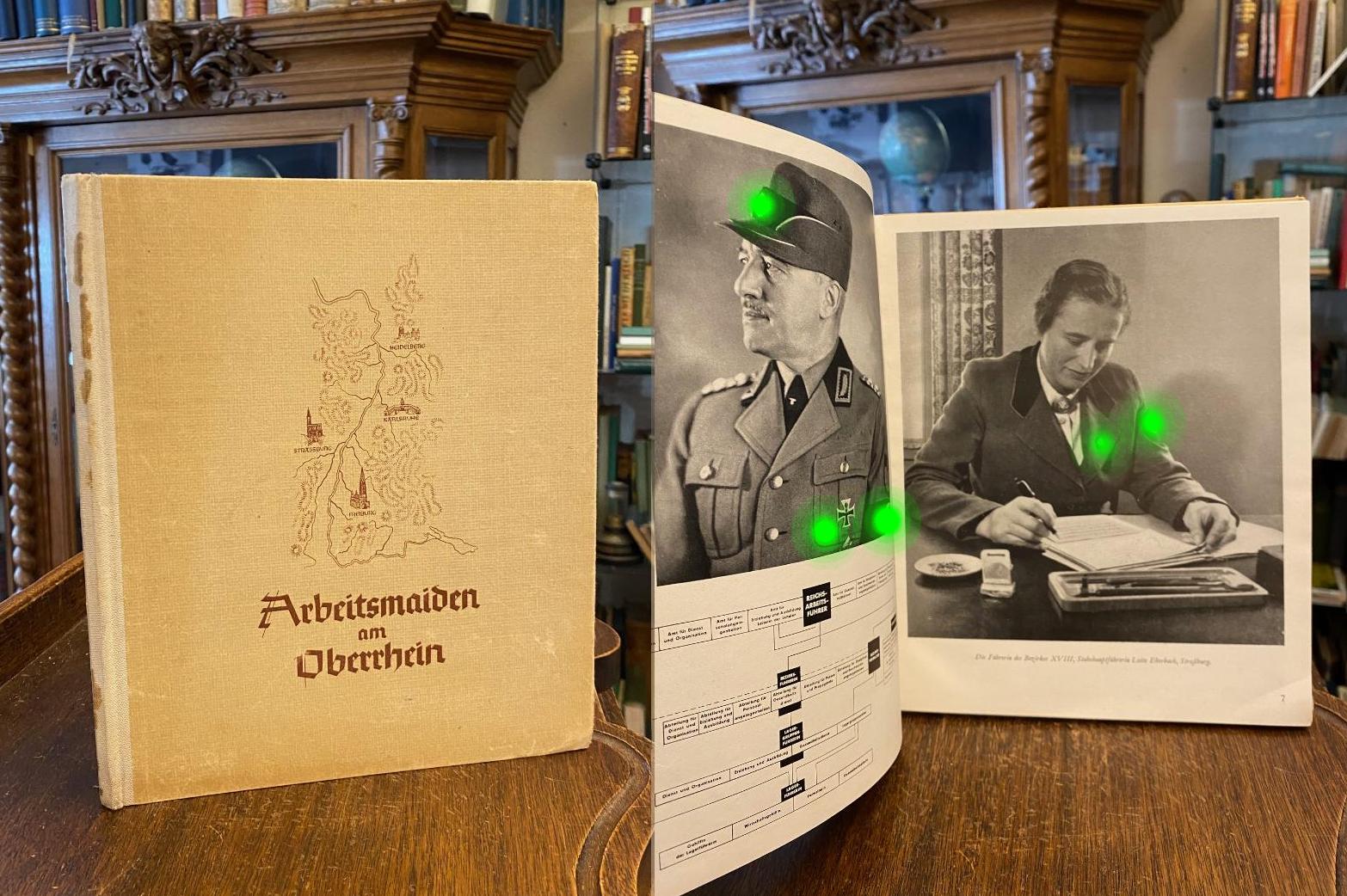 Weiß, Marie: Arbeitsmaiden am Oberrhein : Ein Erinnerungsbuch. Herausgegeben von der Führerin des Bezirkes XVIII Oberrhein des Reichsarbeitsdienstes der weiblichen Jugend. Text und Gestaltung von Maidenhauptführerin Marie Weiß. Berlin, Erich Klinghammer Verlag, [1942]. 48° (25x21), 95 S., mit zahlr. fotograf Aufnahmen sowie einigen Illustrationen, 1 separate Kartenbeilage (des Berzirks XVIII Ober-Rhein = Lagergruppen 180-184), OHln mit kleiner KartenIllustration, etwas berieben, Rückenleinen fleckig, alte Widmung auf hinterem Vorsatz, 2 Fotos mit kleiner Randmarginalie, gutes Exemplar mit geringen Altersspuren, Hinweis auf §86a StGB: Abgabe nur zu Zwecken der staatsbürgerlichen Aufklärung, der Abwehr verfassungsfeindlicher Bestrebungen, der wissenschaftlichen und kunsthistorischen Forschung, der Aufklärung oder Berichterstattung über die Vorgänge des Zeitgeschehens oder der militärhistorischen und uniformkundlichen Forschung. Der Käufer bestätigt mit seiner Bestellung ebenfalls, Bücher mit Emblemen des Dritten Reiches nicht zu propagandistischen Zwecken zu verwenden. —