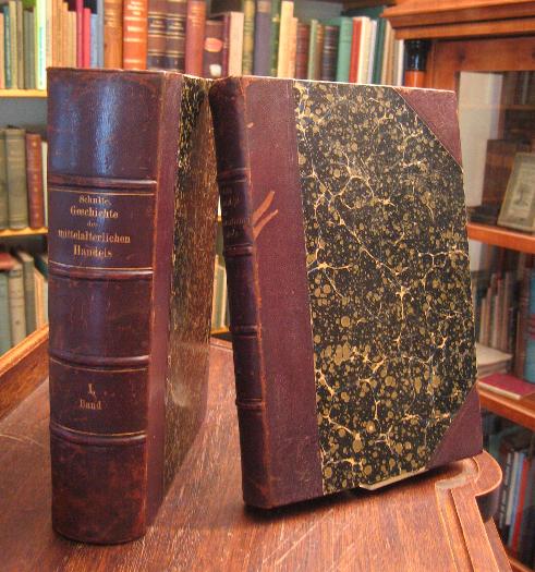 Schulte, Aloys: Geschichte des mittelalterlichen Handels und Verkehrs zwischen Westdeutschland und Italien mit Ausschluß von Venedig [in zwei Bänden]: Band I: Darstellung.– Band II: Urkunden. (1. Aufl.), 2 Bände in 2 (alles). Leipzig, Verlag von Duncker & Humblot, 1900. gr8° (24x16), XXXII,742 ; 358 S., mit 3 gefalteten Stammtafeln und 2 (1 mehrfach gefaltete) Karten, einheitl OHldrbde d.Zt. mit LdrEcken, marmorBezug, SchmuckVorsätze, Leder teils etwas berieben/beschabt, fest sauber und gepflegt,
