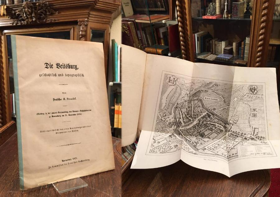 Ravensburg. – Steudel, [Albert]: Die Veitsburg, geschichtlich und topographisch. Vortrag in der Jahres-Versammlung des Bodensee-Geschichtsvereins zu Ravensburg am 21. September 1874. Nebst einer Ansicht des alten Ravensburgs und einer Stammtafel der Welfen. Ravensburg, In Commission der Dorn’schen Buchhandlung, 1875. 8° (25x18), 13 S. + 1 gefaltete Ansicht sowie 1 doppelseitige gefaltete genealogische Tafel, OKart (Brosch) mit Heftstreifen, gering angestaubt, Die lithographierte Ansicht von Ravensburg (26.5x34) von Joseph Bayer nach der Vogelschau von Merian [Heinz, Joseph Beyer; 181].—