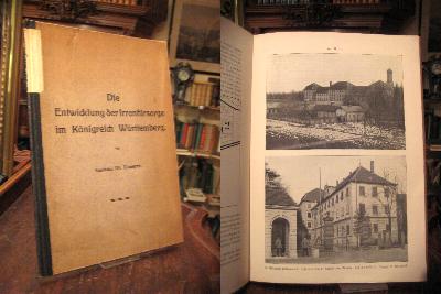 Camerer, [Wilhelm] Die Entwicklung der Irrenfürsorge im Königreich Württemberg. Halle, Carl Marhold Verlagsbuchhandlung, 1911. 4° (28x20), 23 S., mit 12 fotograf Aufnahmen und Plänen, OHln mit handschriftl RSchild, etwas angestaubt und gebräunt, Stempel auf Titelblatt, fest und sauber, [= SA Deutsche Heil- und Pflegeanstalten für Psychischkranke in Wort und Bild ; II], mit Lageplänen und Aufnahmen der Heilanstalten Zwiefalten, Winnental, Bad Schussenried, Weissenau und Weinsberg.–