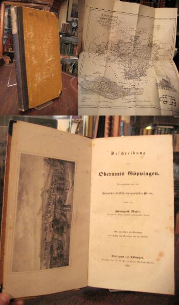 Göppingen, Oberamt. – Moser, [Rudolph Friedrich von]: Beschreibung des Oberamts Göppingen. Herausgegeben von dem Königlich statistisch-topographischen Büreau. Mit einer Karte des Oberamts, einer Ansicht von Göppingen und vier Tabellen. Stuttgart-Tübingen, Verlag der J.G. Cotta’schen Buchhandlung, 1844. gr8° (23x13), IV, 302, (2) S., mit lith Frontispiz, 4 gefalteten Tabellen, 1 gefaltete mit Oberamtskarte mit Plan und Kirchenansicht, [so komplett], Hln d.Zt., etwas bestossen, 1 Doppelblatt (S.167-170) nachträglich mit Papierstreifen alt nachfixiert und etwas überstehend, vereinzelte Bl. etwas stockfleckig, Karte angerändert, Besitzvermerk aV/versoFrontispiz, sonst fest und sauber,