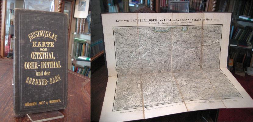 Glas, Gustav: Karte vom Oetzthal, Ober-Innthal und der Brennerbahn zwischen Zugspitze, Landeck und Franzensfeste im Maass 1 : 280,000. München, Verlag von Mey & Widmayer, [1873]. 8° (16.5x9), 8 Segmente a 16x9 (Gesamtgröße: 26x29) Oln mit goldTitel, sauber und gepflegt,
