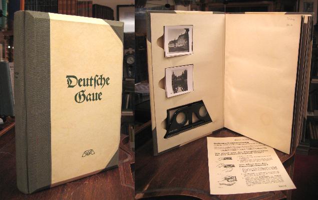 Czibulka, Alfons von: Deutsche Gaue. Mit 200 Raumbild-Aufnahmen. Diessen am Ammersee, Raumbild-Verlag Otto Schönstein, (1938). 4°, 191 S., mit 199 von 200 Raumbilder, davon die ersten 72 als Dreierpaare auf Tafeln montiert, die Bilder 73-200 in 5 Fächern des Vorder- und Rückendeckels, das 6. Fach mit Originalbrille, dabei Nutzungsanweisung, OHln, Papier minimal gebräunt, Lackierung der Brille minimal berieben, nahezu ungenutzt, (aber: es fehlt 1 Bild), [Heidtmann (1989/2) 18566.– DHM, Lorenz, Schönstein-Bibliographie; (Allgemeine Augsaben) 2.10].–