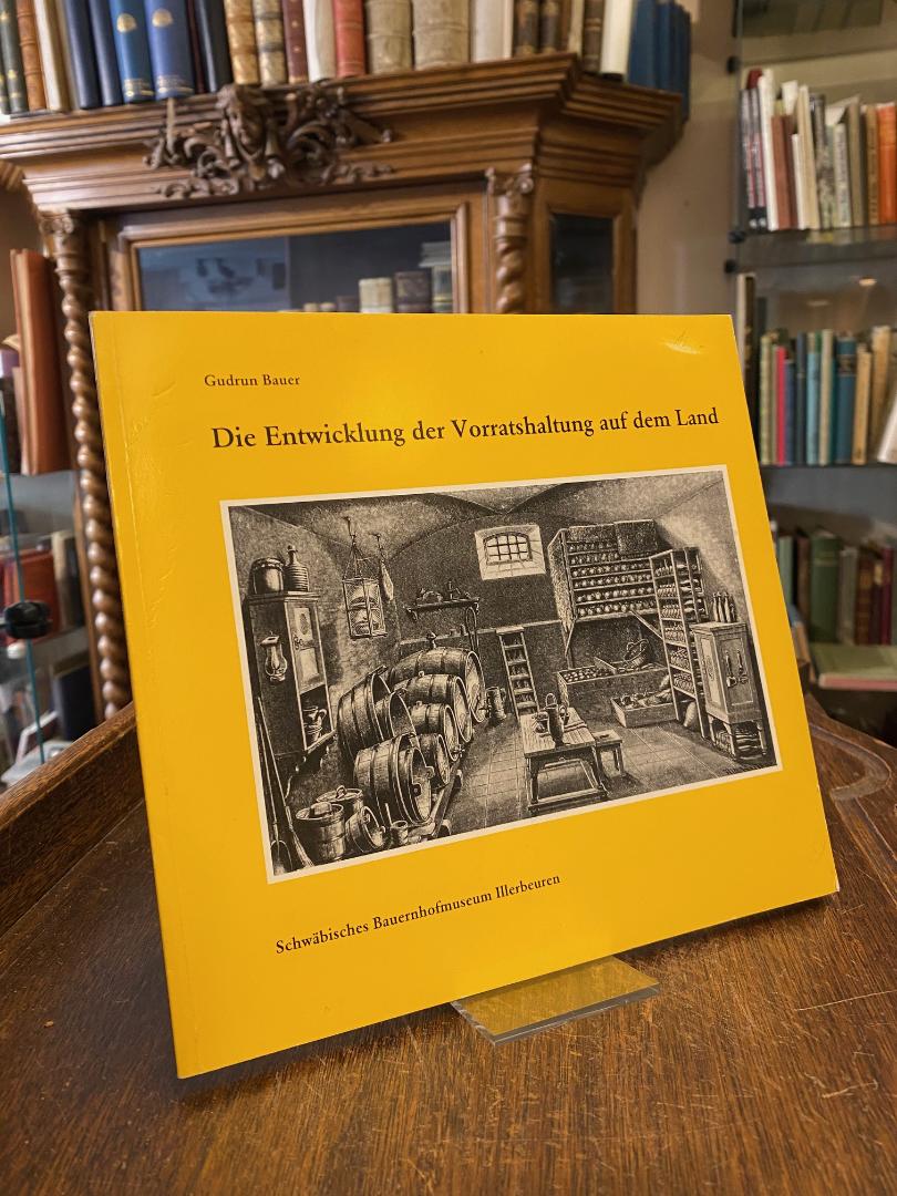 Bauer, Gudrun: Die Entwicklung der Vorratshaltung auf dem Land. Kronburg-Illerbeuren, Schwäbisches Bauernhofmuseum Illerbeuren, (1991). 8°quer (20x21), 59 S., mit zahlr. fotograf Aufnahmen, Faksimiles, ill OKart (Brosch), Umschlag mit kleiner Abriebstelle, 2 S. mit Farbmarkierungen, sonst sauber und wohlerhalten,