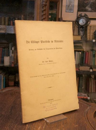 Esslingen. – Müller, Karl: Die Esslinger Pfarrkirche im Mittelalter : Beitrag zur Geschichte der Organisationen der Pfarrkirchen. Stuttgart, Verlag von W. Kohlhammer, 1907. 8° (24x16), VI, 90 S., mit 1 gefalteten Plan der Reichsstadt Esslingen im 18.Jahrhundert, OKart (Brosch), etwas angestaubt, Umschlag mit Namensstempel, unbeschnitten/unaufgeschnitten, fest und sauber, [= SA aus Württembergische Vierteljahresheft für Landesgeschichte; NF XVI, (1907)],