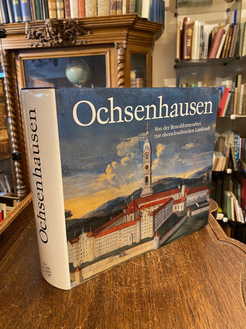 Ochsenhausen. – Herold, Max (Hrsg): Ochsenhausen : Von der Benediktinerabtei zur oberschwäbischen Landstadt. Weißenhorn, Anton H. Konrad Verlag, (1994). gr8°quer (22x24), 879 S., mit 313 teils farb TafelAbb., Faksimile und Karten, 1 gefalteter Stammbaum, blauer Oln mit goldTitel mit ill OU, Umschlag rückseitig mit kleiner Schramme, sonst ohne Gebrauchsspuren, offensichtlich ungelesen, schönes gepflegtes Exemplar, enthält: Adolf Köhler: Allgemeiner Überblick über Markung und Stadt.– E.Heizmann und Volker Sach: Die Sandgrube Edelbeuren.– Karl-Heinz Pfeilsticker: Der Wald um Ochsenhausen.– Hans Peter Köpf: Die Gründer des Klosters Ochsenhausen.– Hugo Ott: Die Zeit des Priorats.– Ewald Gruber: Grund- und Gerichtsherrschaft der Reichsabtei Ochsenhausen.– Peter Blickle: Arbeit, Alltag und Recht. Wandlungen in der Ochsenhausener Grundherrchaft an der Wende vom Mittelalter zur Neuzeit.– Hermann Grees: Siedlung und Sozialstruktur im Gebiet des Klosters Ochsenhausen bis zum Ende der Klosterzeit (1803).– Albrecht Miller: Die Kunstgeschichte des Klosters Ochsenhausen im Mittelalter und in der Renaissance.– Konstantin Maier: Die Krise der Reformation und die Restauiration der Ordensdisziplin im 16.und 17.Jahrhundert im Kloster Ochsenhausen.– ders.: Bildung und Wissenschaft im Kloster Ochsenhausen.– ders.: Pietas Ochsenhusana. Form und Gestalt ochsenhausischer Frömmigkeit im 17.und 18.Jahrhundert.– ders.: Die Äbte des Klosters Ochsenhausen im 17.und 18.Jahrhundert.– Leopold M.Kantner und Michael Landenburger: Zur Pflege der Musik im Reichsstift Ochsenhausen.– Alto Brachner: Naturwissenschaften im Kloster Ochsenhausen.– Volker Press: Die beiden Fürsten von Ochsenhausen (Franz Georg Metternich und Clemens Wenzel Lothar Metternich).– Hermann Grees: Aus der Geschichte des Kloster- und Marktfleckens Ochsenhausen in der Klosterzeit.– Hans-Otto Binder: Vom Markt zur Stadt (1806/25 bis 1951).– Hermann Grees: Aus der Geschichte von Hattenburg, Reinstetten, Eichen, Goppertshofen und Wasenburg, Laubach, Wennedach, Mittelbuch, Bebenhaus.– Willi Bernhard: Von der Klosterschule zur Volksschule.– Max Herold: Ochsenhausen einst und jetzt. Die Entwicklung nach dem Zweiten Weltkrieg bis heute.– Dieter Hauffe: ‚Die Klosterstadt auf dem Berg‘. Bauter, Höfe, Plätze, Gärten als Sanierungsaufgabe 1960-1990.– Otto Beck: Von der Klosterpfarrei zur Kirchengemeinde. St.Georg in Ochsenhausen 1803-1993.– Karl-Heinz Pfeilsticker und Hans Leonhardt: Die Evangelische Pfarrei Ochsenhausen.– Kurt Diemer: Vereine und Gruppierungen in der Stadt.— durch Register erschlossen