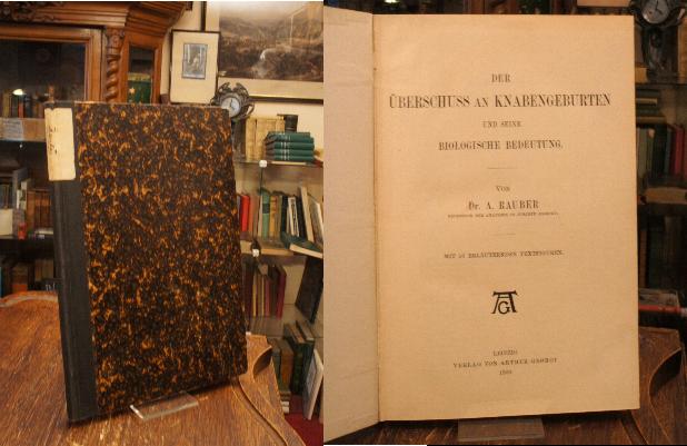 Rauber, [August]: Der Überschuss an Knabengeburten und seine biologische Bedeutung. Leipzig, Verlag von Arthur Georgi, 1900. 8° (22x16), (IV), 220 S., mit 16 erläuternden Textfiguren, HartBroschur d.Zt. mit handschriftl Rschild, Ecken etwas bestossen, fest sauber und gepflegt, August Rauber (1841-1917) Professor der Anatomie in Jurjeff (Dorpat)