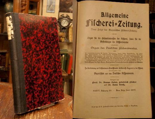 Hofer, Bruno / Fischer, Friedrich / Reuß, Hans [Red]: Allgemeine Fischerei-Zeitung XXXVI. Jahrgang 1911, Neue Folge Band XXVI. Neue Folge der Bayerischen Fischerei-Zeitung. Herausgegeben vom Bayerischen und dem Deutschen Fischereiverein. Organ für die Gesammt-Interessen der Fischerei, sowie für die Bestrebungen der Fischereivereine, insonderheit Organ des Deutschen Fischereivereins, der Landesfischereivereine für Bayern, Sachsen, Württemberg, Baden, des Westdeutschen Fischereiverbandes etc. Augsburg, Gebrüder Reichel, 1911. 4° (26x17), X , 546 S., marmor Hln d.Zt. mit handschriftl RSchild (dieses fast abgerieben), obEinbandEcke mit kleiner oberflächlicher FeuchtigkeitsSpur, gelegentlich minimal fleckig, sonst fest sauber und gepflegt, [ = Allgemeine Fischerei-Zeitung Jg 36 / NF 26 (1911)], (Fischereizeitung) kompletter Jahrgang 1911 mit 24 Heften, durch Register erschlossen.–