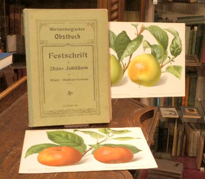 Württembergisches Obstbuch : Ein praktisches Handbuch für jeden Obstgartenbesitzer. Zum 25jährigen Jubiläum des Württembergischen Obstbauvereins e.V. herausgegeben von dessen Ausschuss. Festgabe für die aktiven Mitglieder des Württembergischen Obstbauvereins. Stuttgart, Selbstverlag des Württembergischen Obstbauvereins, 1905. gr8° (23x16), VIII, 246 S., mit zahlr. TextAbb. und 20 SchädlingsAbb. auf 5 chromolith Tafeln, Deckelschlaufe mit 14 chromolith Tafeln (6xÄpfel, 6xBirnen, 2xBlüten) [so komplett], OHln HartBrosch, dreiseitiger Rotschnitt, Deckel fußseitig mit kleinem oberflächlichen Feuchtigkeitsfleck, FußSchnitt mit kleiner Feuchtigkeitsspur, Rückendeckel gering angeschmutzt, hinteres Vorsatzblatt mit Knickfalte, sehr ordentliches frisches Exemplar,