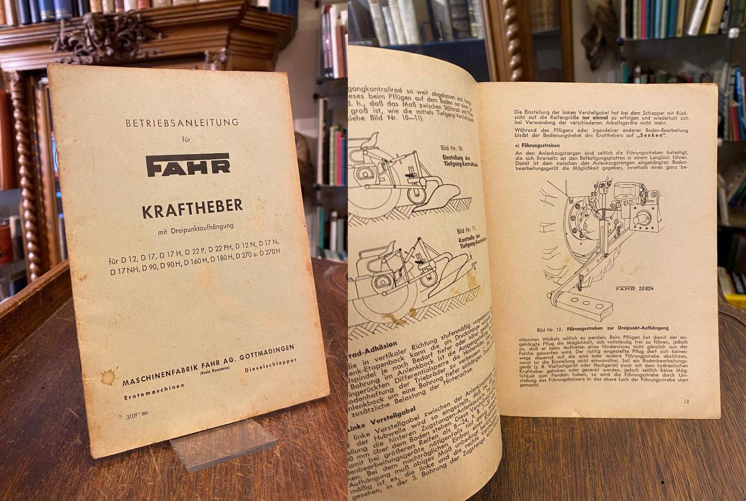 Fahr, Marschinenfabrik : Gottmadingen (Hrsg): Betriebsanleitung für Fahr Kraftheber mit Dreipunktaufhängung für D 12, D 17, D 17 H, D 22 P, D 22 PH, D 12 N, D 17 N, D 17 NH, D 90, D 90 H, D 160 H, D 180 H, D 270 und D 270 H. Gottmadingen, Maschinenfabrik Fahr AG, [1958]. 8° (21x15), 19 S., mit zahlr. Abb., 2 eingefaltete Tafeln, OKart (Brosch), etwas lichtverfärbt und angeschmutzt, gutes Exemplar, [= Verlags-Nr. 3109/583],